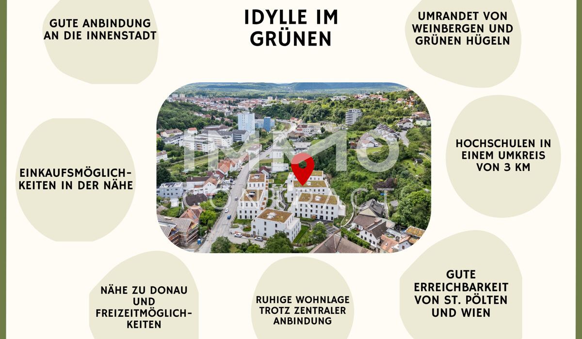Diese exklusive Neubauwohnung liegt in einer begehrten Wohnlage von Krems an der Donau – ruhig gelegen, umgeben von grünen Weinbergen und dennoch nur wenige Minuten von der lebendigen Kremser Innenstadt entfernt.