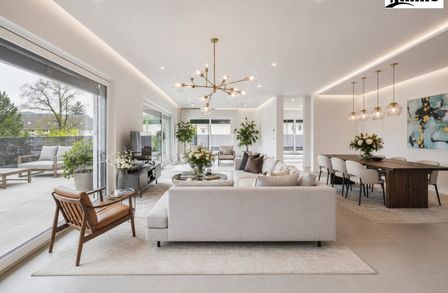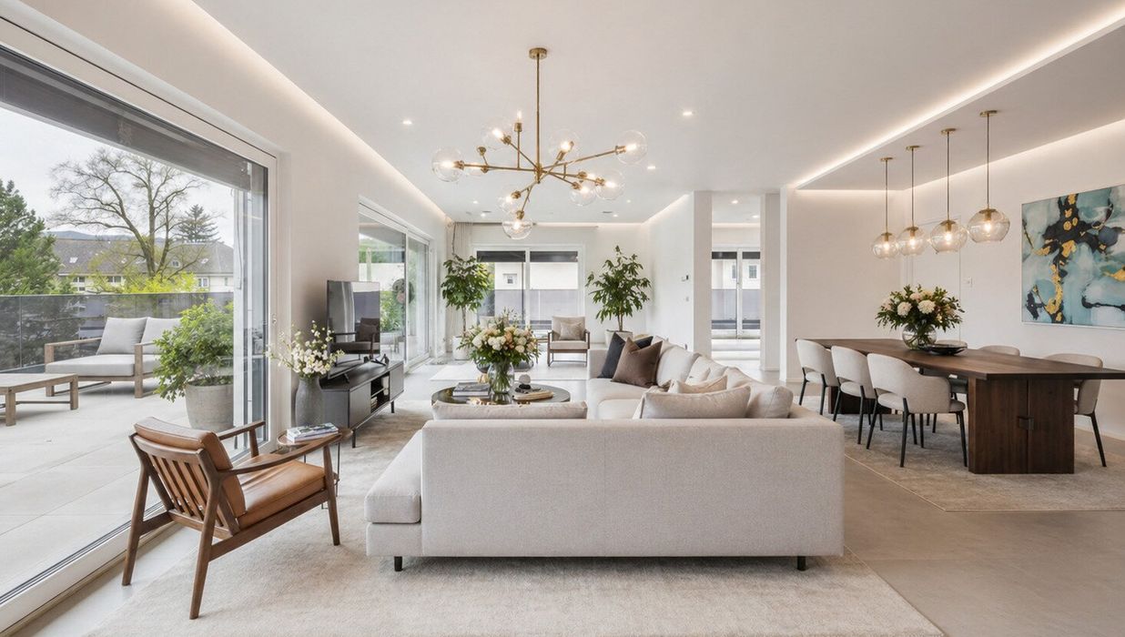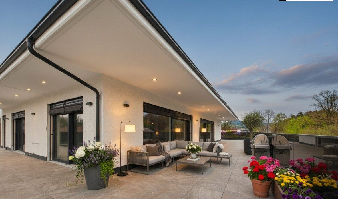 Innen und Außen verschmelzen zu einem einzigartigen Wohngefühl – perfekt für stilvolles Wohnen, Empfänge oder entspannte Abende mit Blick in die Umgebung.