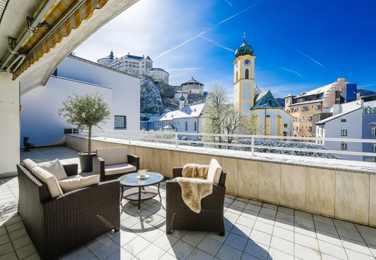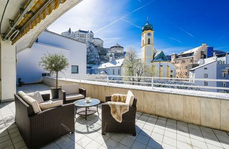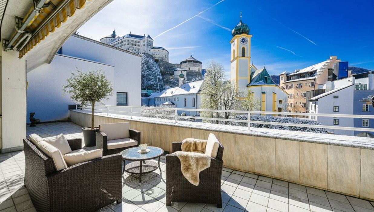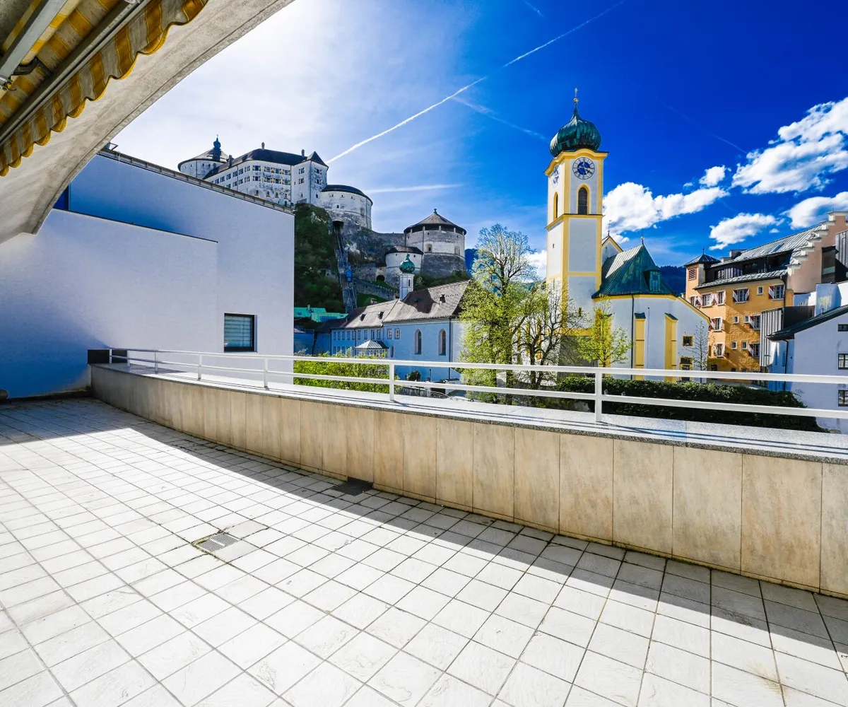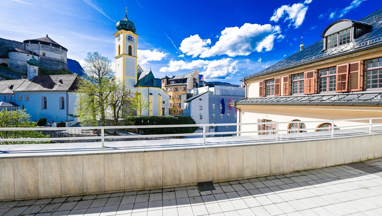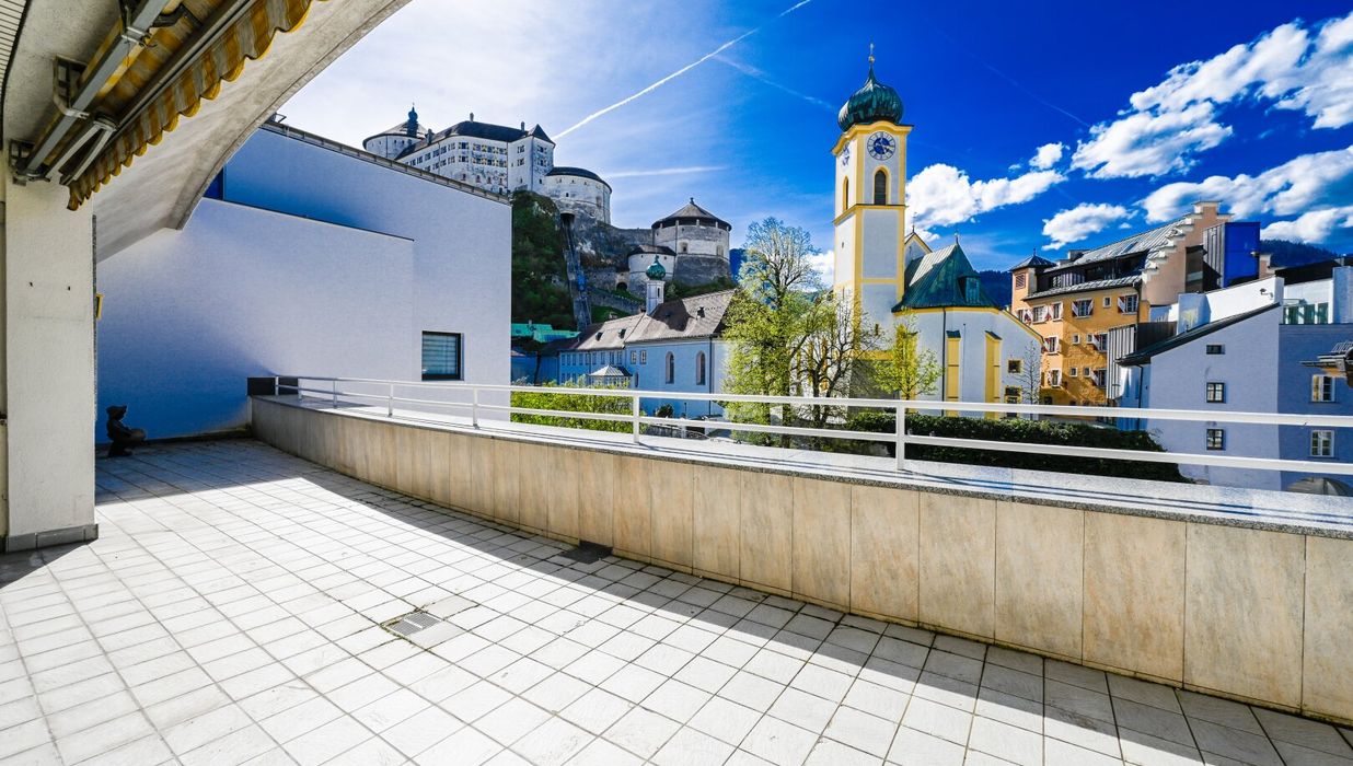Diese 145 m² Penthouse-Eigentumswohnung beeindruckt durch den Ausblick auf die Festung, Kirche und Stadt Kufstein. Auf der 44,5 m² großen Terrasse haben Sie von Mittags bis Abends Sonne. Hier werden Sie viele schöne Stunden im Freien mit Ihrer Familie und Freunden genießen können.