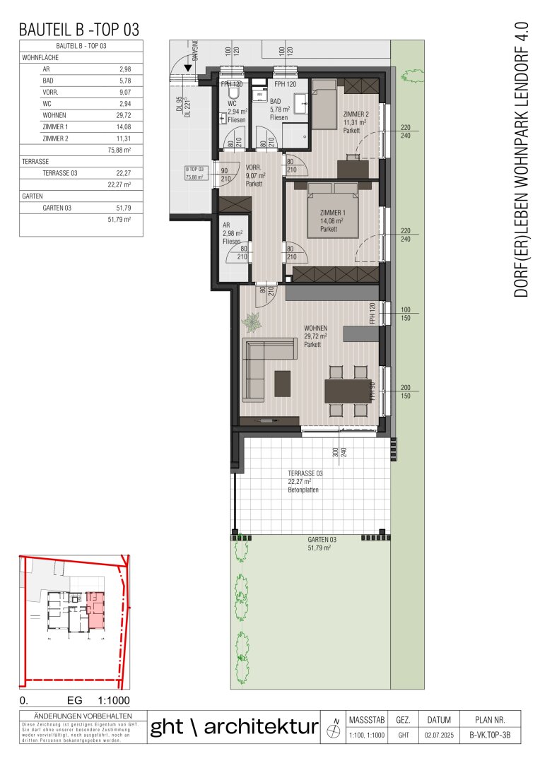 Top B3: WFL 75,88 m² | Terrasse: 21,67 m² | Garten: 51,61 m² | KP € 365.000,-