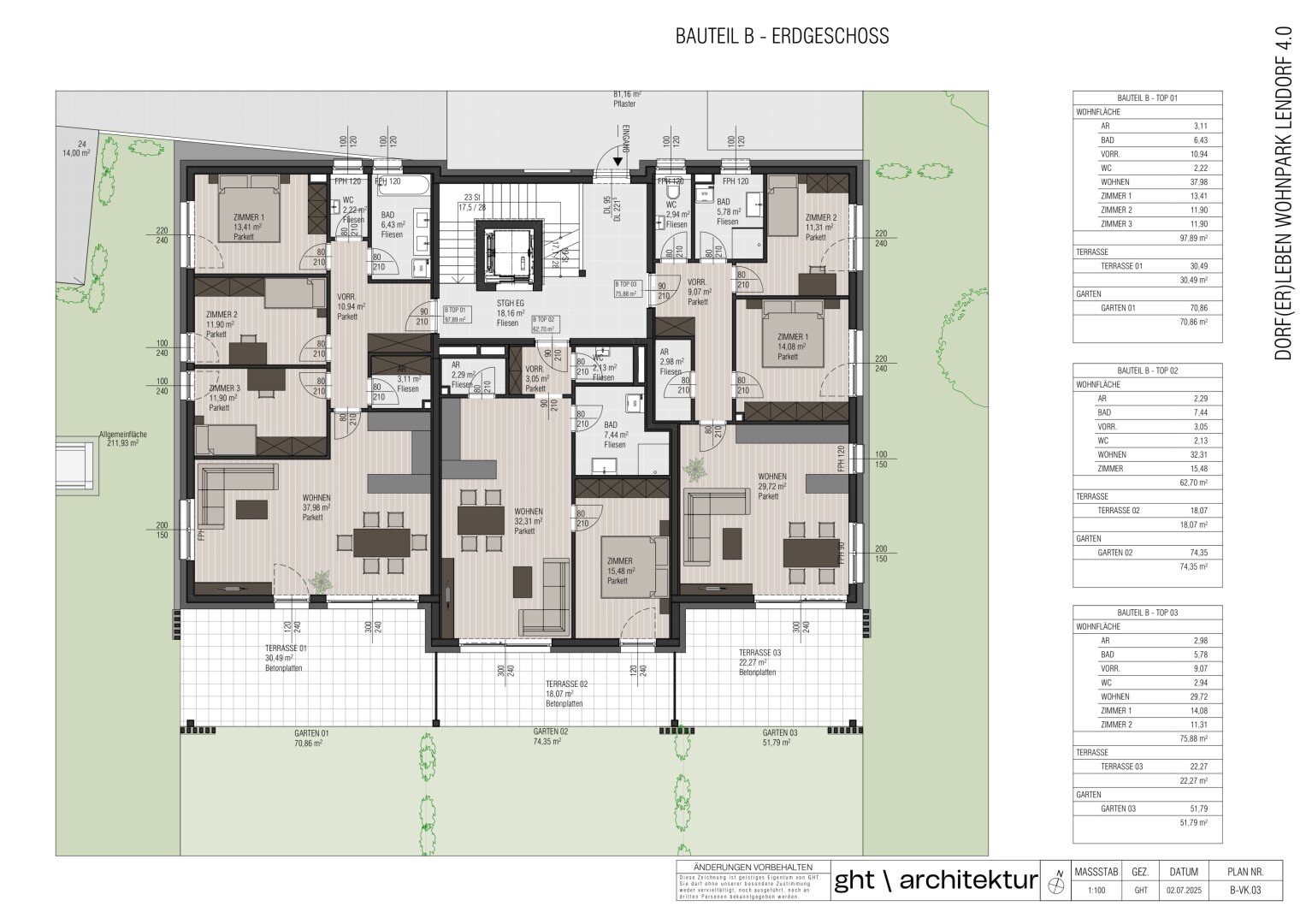 Top B1: WFL 97,89 m² | Terrasse: 29,92 m² | Garten: 70,25 m² | KP € 450.000,-