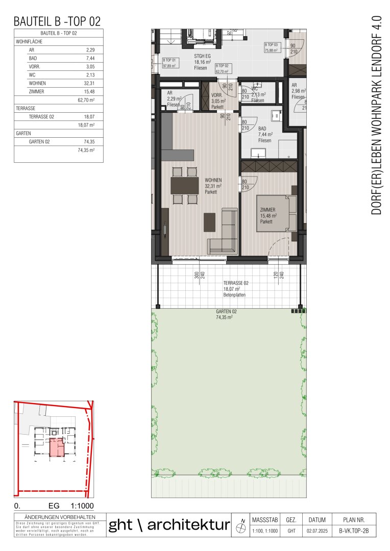 Top B2: WFL 62,70 m² | Terrasse: 19,48 m² | Garten: 73,96 m² | KP € 320.000,-