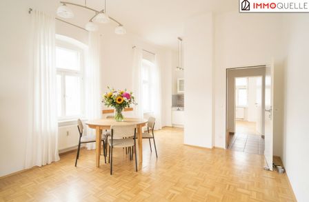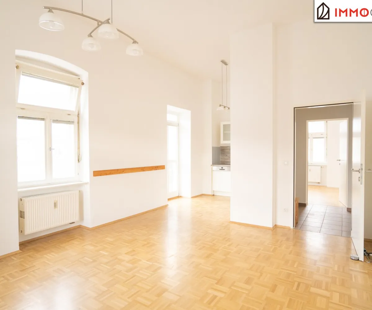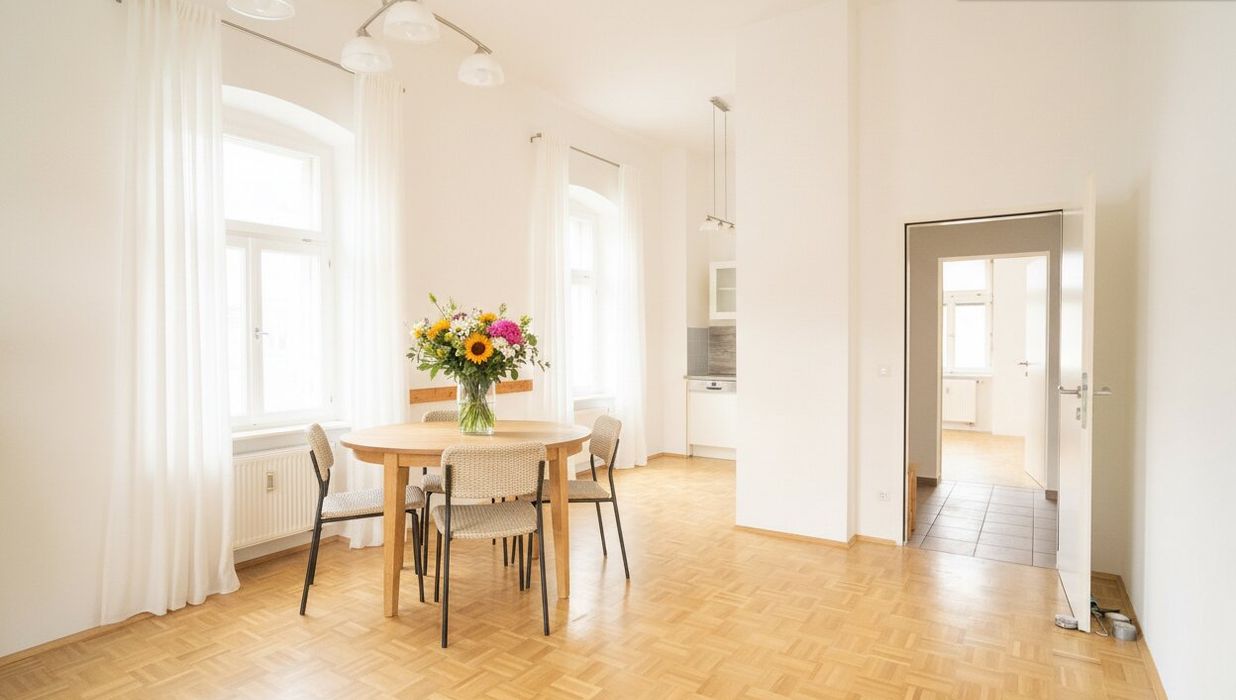 Links vom Flur öffnet sich der großzügige Wohn-Essbereich - mit südlicher und westlicher Ausrichtung , durchflutet von natürlichem Licht. Die moderne Einbauküche ist harmonisch integriert und lädt zum Kochen, Genießen und Zusammensein ein. Große Fensterfronten und edler Parkettboden schaffen eine warme, einladende Atmosphäre.