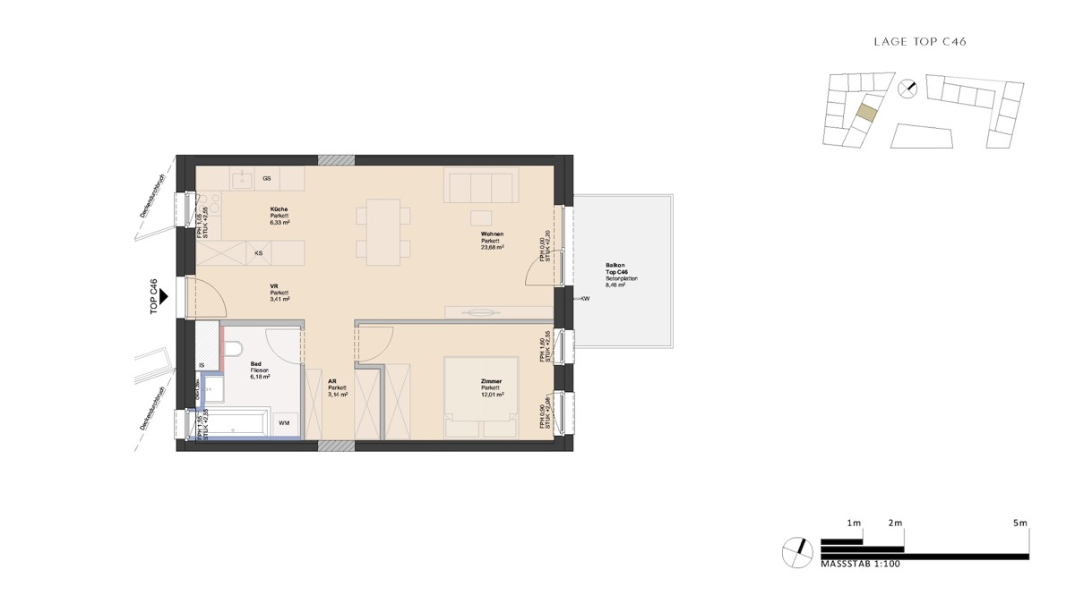 Das Projekt G r ü n G e b o r g e n befindet sich am ruhigen Rand des Linzer Stadtteils Neue Heimat, eingebettet in eine angenehme Wohngegend. In einer Sackgasse ohne Durchzugsverkehr gelegen, bietet die Adresse ein hohes Maß an Privatsphäre und Lebensqualität. Direkt angrenzend erstreckt sich eine Einfamilienhaussiedlung, in unmittelbarer Nachbarschaft befinden sich gepflegte Schrebergärten – ein Bild von Ruhe und naturnahem Wohnen. Im näheren Umfeld sorgen einige Gewerbebetriebe sowie der Maximarkt als Nahversorger für kurze Wege im Alltag. Ein besonderes Highlight ist die Nähe zur Traunau, einem geschützten Naturparadies, das nur wenige Minuten entfernt liegt. Die weitläufige, naturbelassene Aulandschaft lädt zu Spaziergängen, Joggingrunden oder Radtouren ein – über schmale, reizvolle Pfade mitten durch die grüne Oase. Auch in puncto Mobilität ist das Projekt G r ü n G e b o r g e n gut angebunden: Die Bushaltestelle Baintwiese befindet sich direkt beim Wohnprojekt und bietet Anschluss an den Stadtverkehr sowie Schnellbuslinien. Wer lieber mit dem Zug unterwegs ist, erreicht den Bahnhof Linz-Wegscheid in rund 15 Gehminuten.