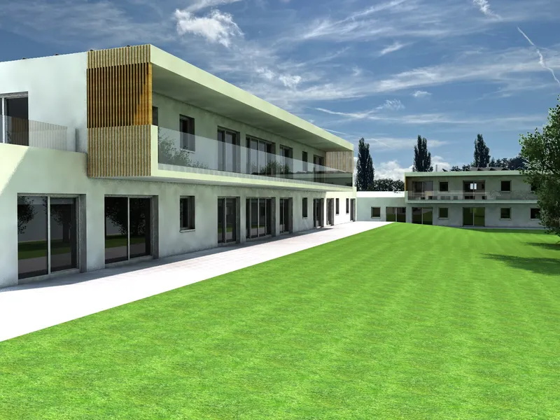 Für die Wohnungen des Obergeschosses ist ein Teil der weitläufigen Grünflächen als Erholungsfläche nutzbar, zusätzlich zu ihren direkten und exklusiven Balkon- und Terrassenflächen.
