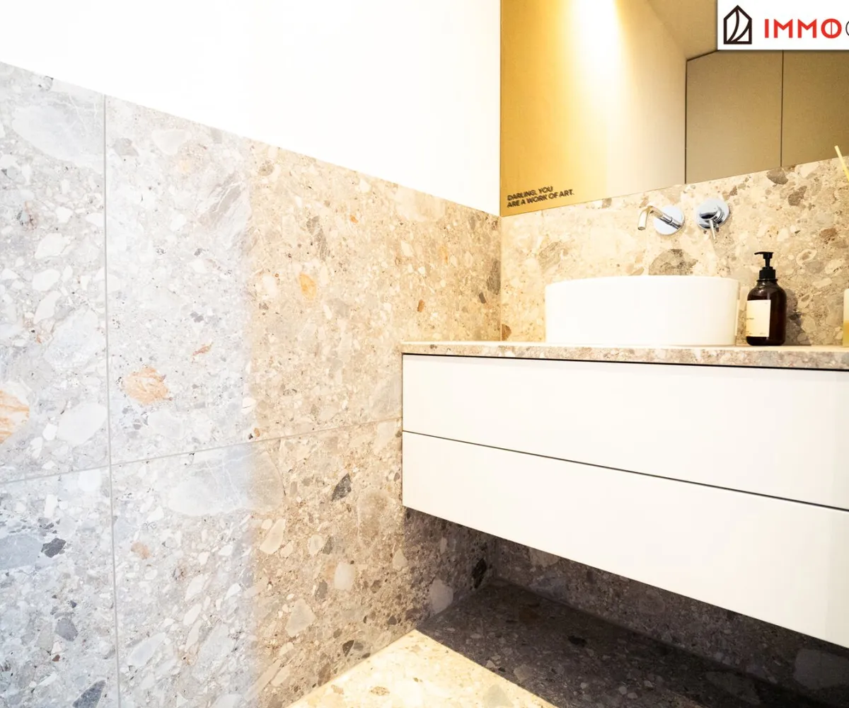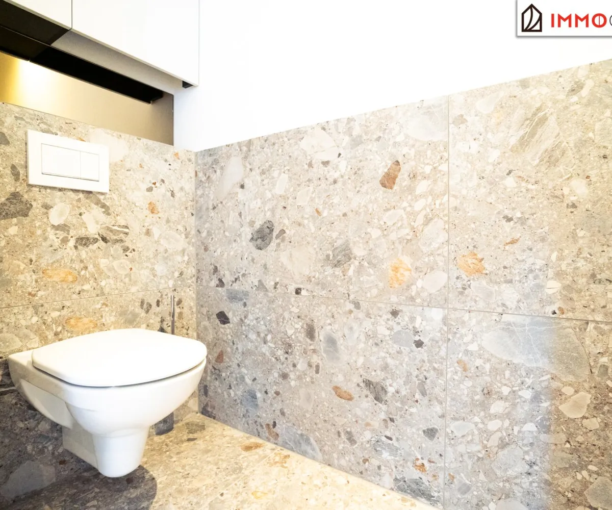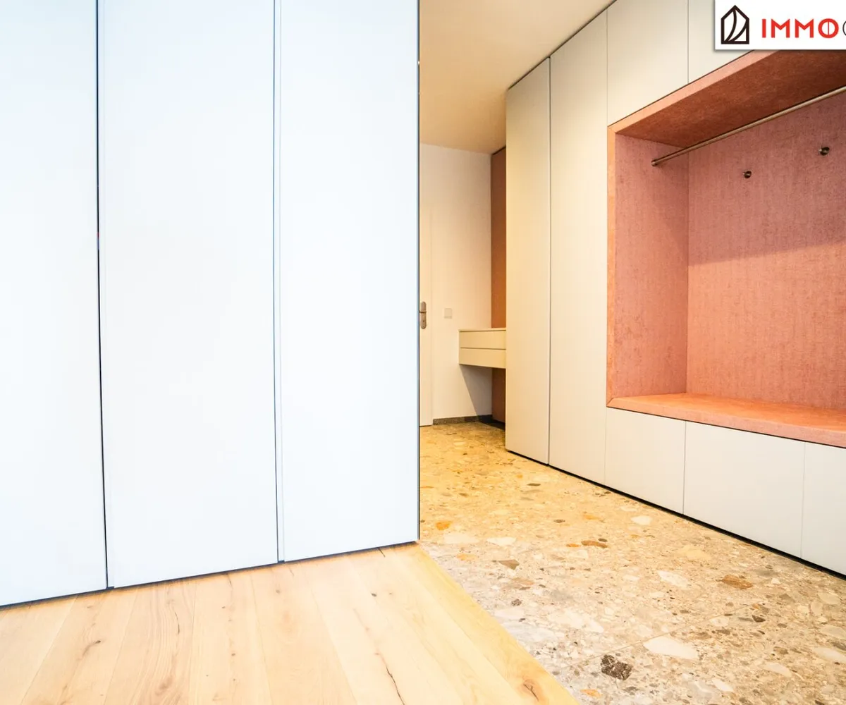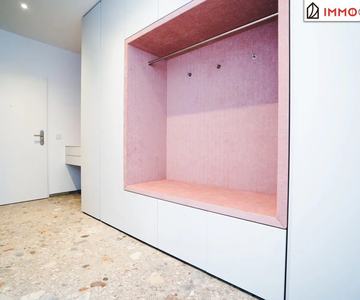 Bereits der Eingangsbereich empfängt mit eleganten Einbauschränken und einer spiegelverkleideten Garderobe. Der edle Terrazzo-Boden im Flur , dem Badezimmer und dem Gäste-WC zieht sofort die Blicke auf sich – mit seiner markanten Maserung und mineralischen Optik verleiht er den Räumen eine urbane Eleganz, die einen reizvollen Kontrast zum warmen Echtholzparkett in den Wohn- und Schlafbereichen bildet.