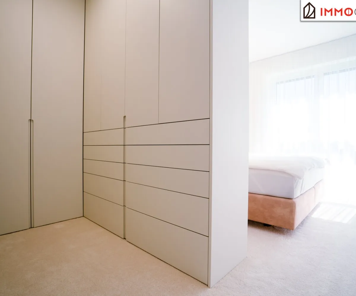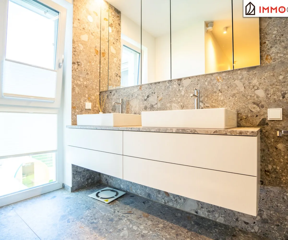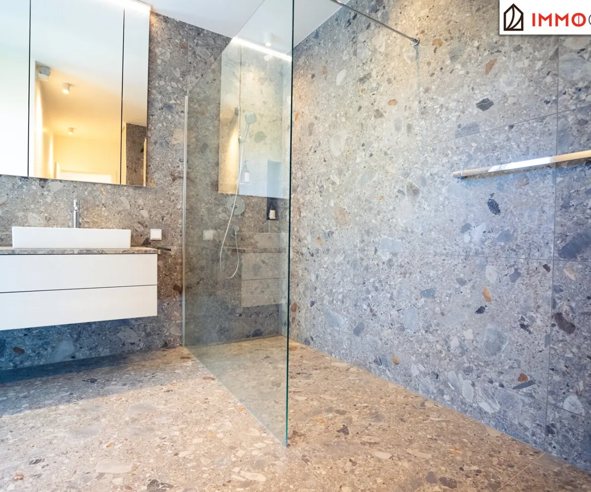 Drei Schlafzimmer , darunter ein Master-Bedroom mit begehbarem Schrank, Teppichboden und beiger Wandtapete, bieten individuellen Rückzugsraum. Das stilvolle Badezimmer mit begehbarer Dusche und hochwertigem Waschtisch wird durch den Terrazzo-Boden nicht nur funktional, sondern auch optisch zu einem echten Statement.
