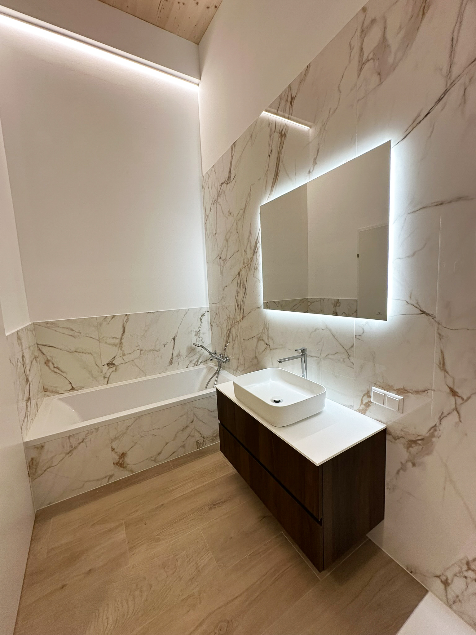 edles Eichenparkett und großformatige Feinsteinzeugfliesen