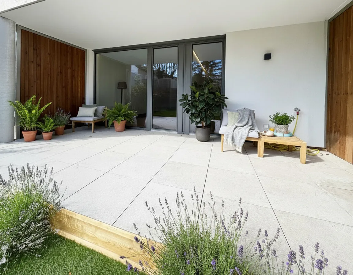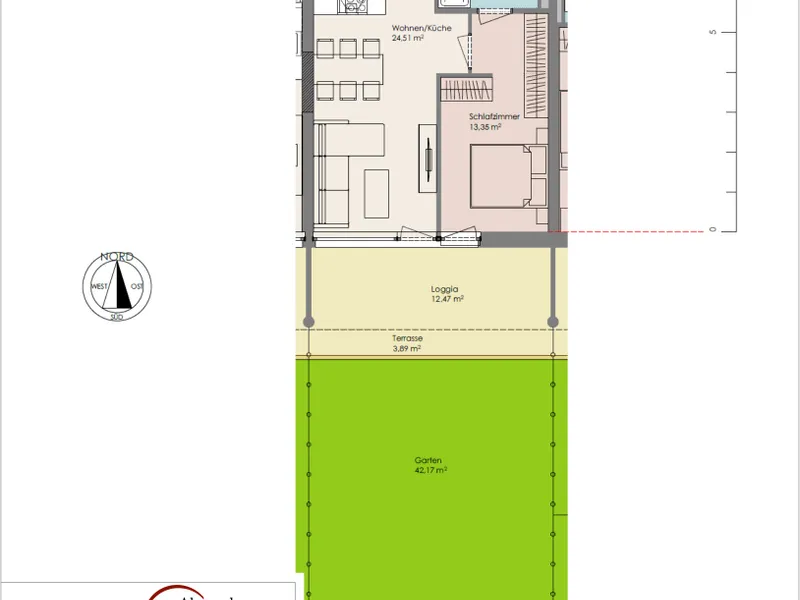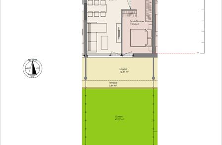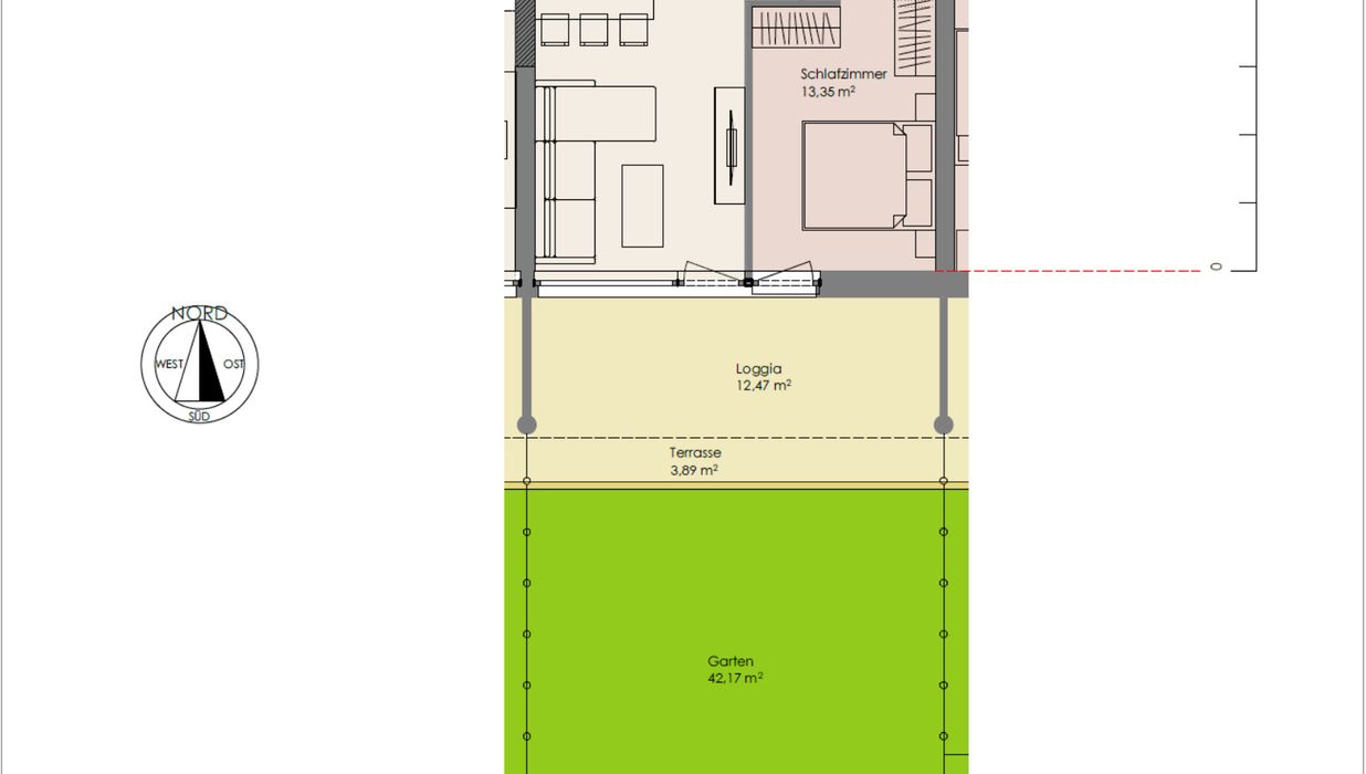 Die Kombination aus Loggia, Terrasse und großem Garten schafft zusätzlichen Wohnraum im Freien und bietet Raum für Erholung und Freizeitaktivitäten.