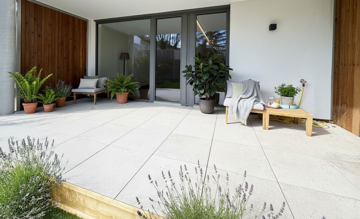 edles Eichenparkett und großformatige Feinsteinzeugfliesen