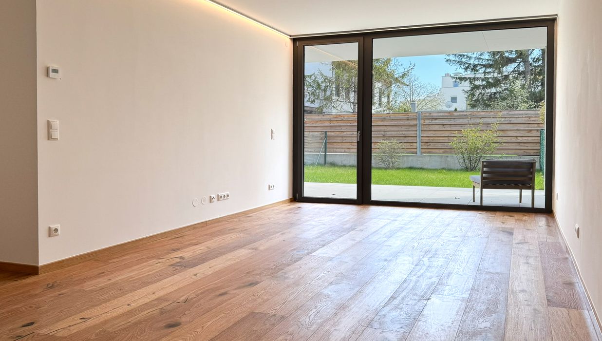 Der Wohn- und Essbereich bildet das Zentrum der Wohnung und bietet direkten Zugang zur Loggia, Terrasse und zum eigenen Garten. Große Fensterflächen sorgen für ein helles und freundliches Wohnambiente.