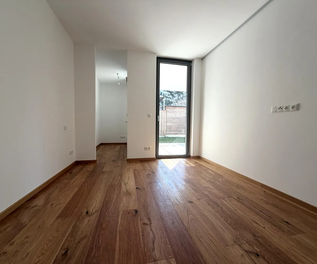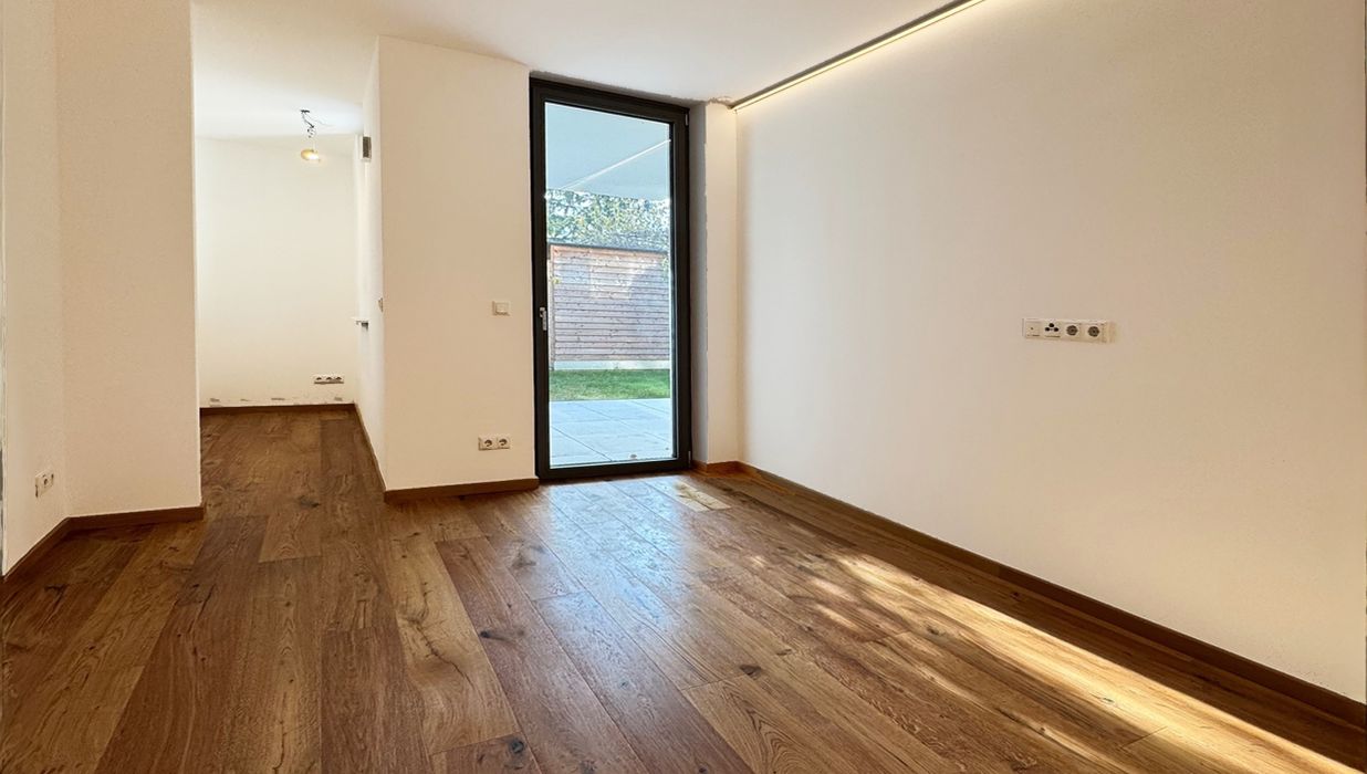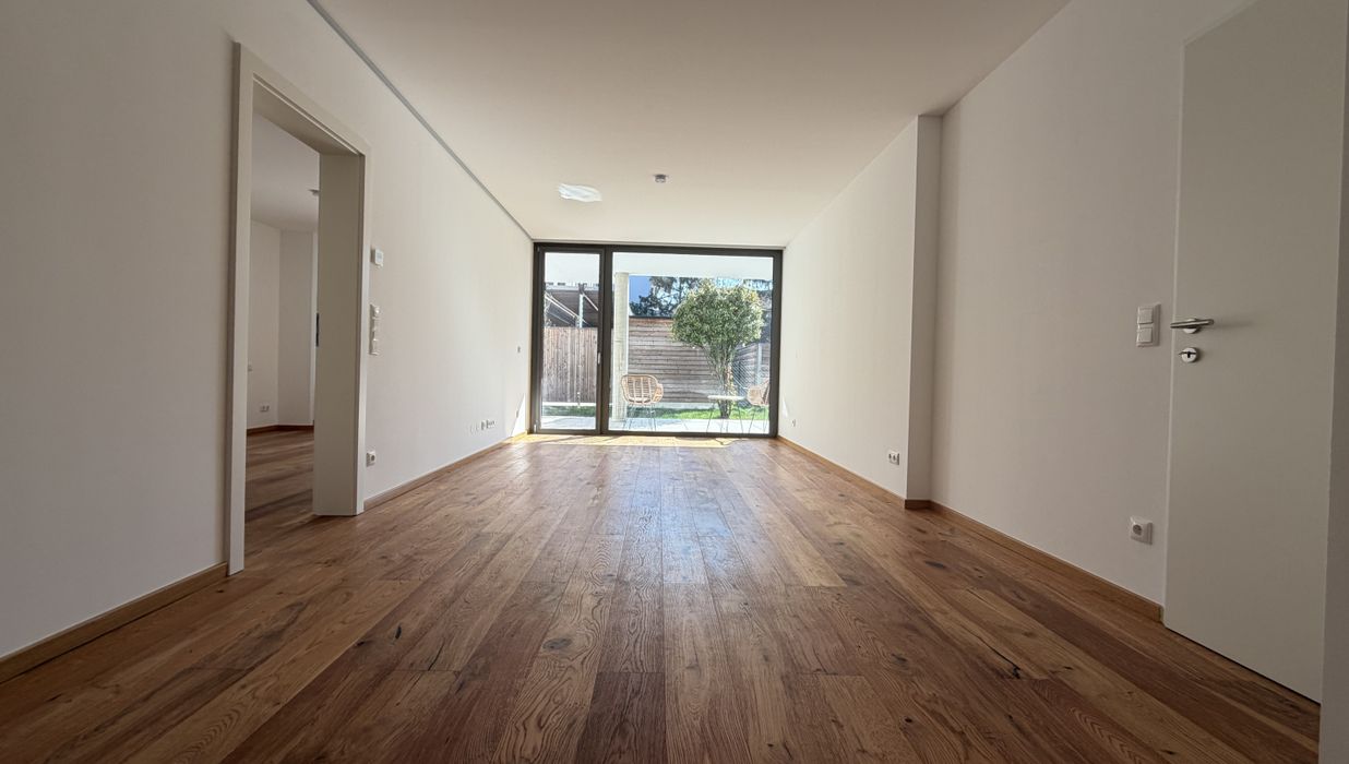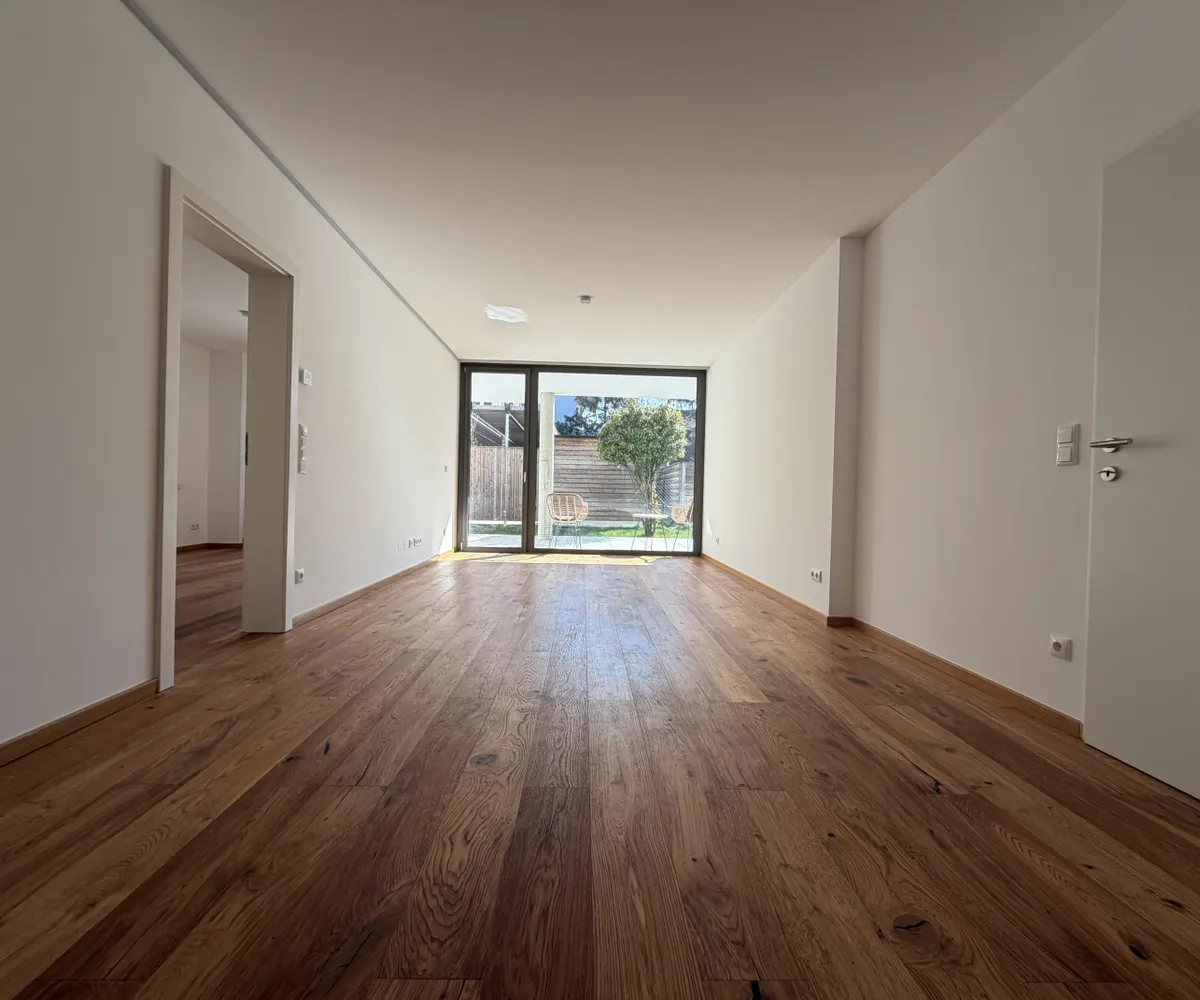Der Wohn- und Essbereich bildet das Herzstück der Wohnung und bietet direkten Zugang zur Loggia, Terrasse und zum eigenen Garten. Große Fensterflächen sorgen für ein lichtdurchflutetes, freundliches Wohnambiente.