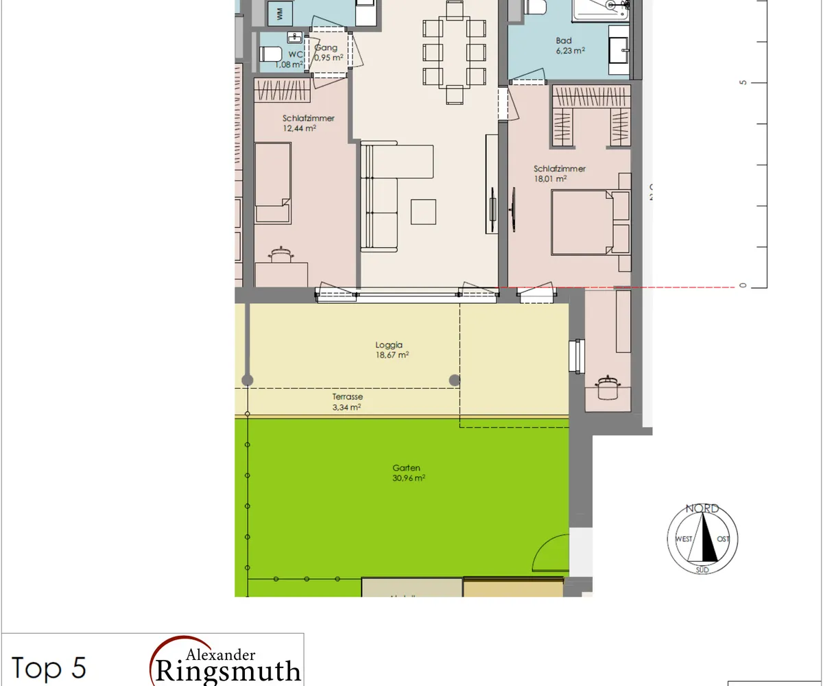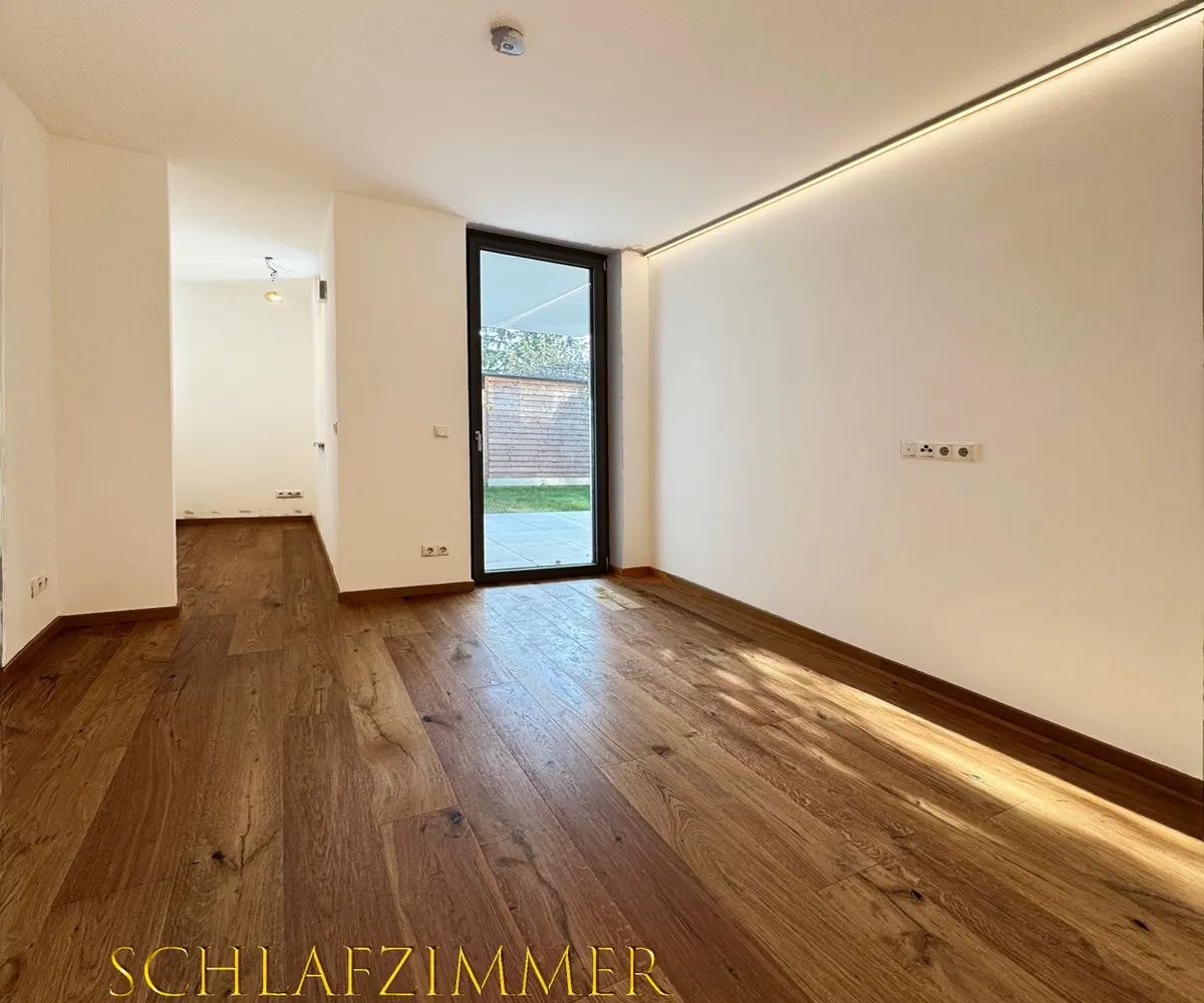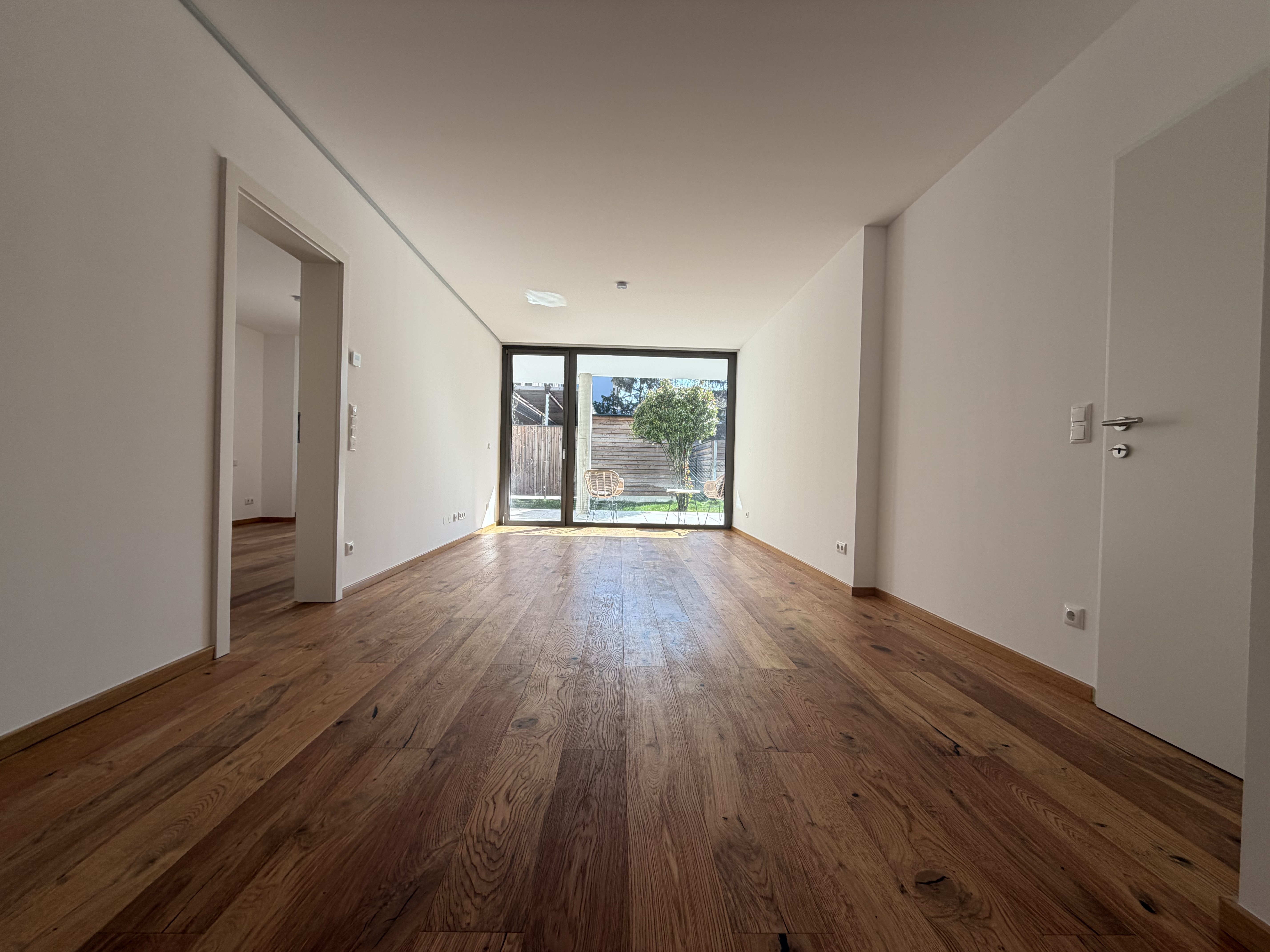 Der Wohn- und Essbereich bildet das Herzstück der Wohnung und bietet direkten Zugang zur Loggia, Terrasse und zum eigenen Garten. Große Fensterflächen sorgen für ein lichtdurchflutetes, freundliches Wohnambiente.