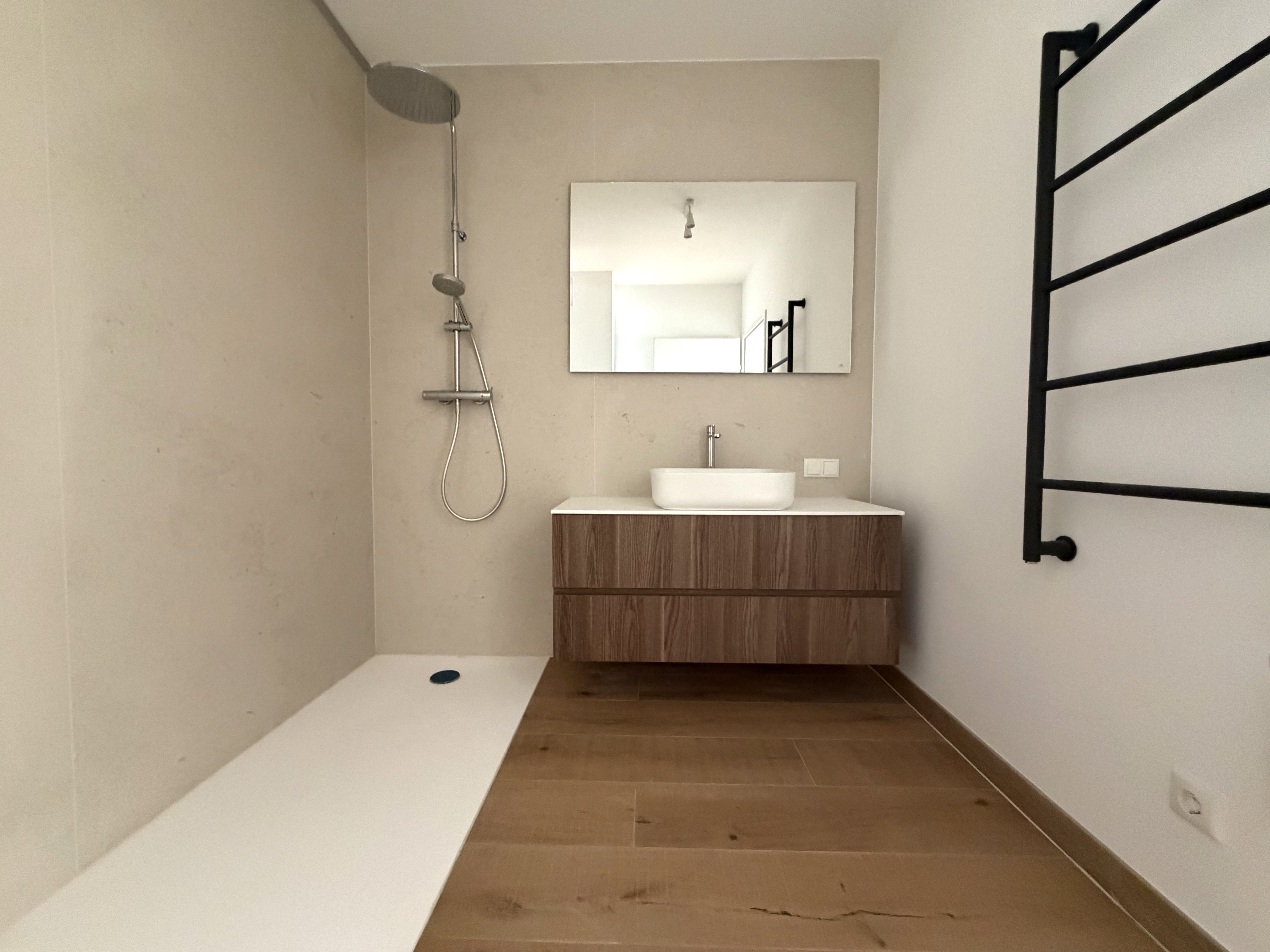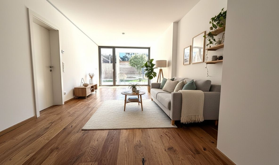edles Eichenparkett und großformatige Feinsteinzeugfliesen