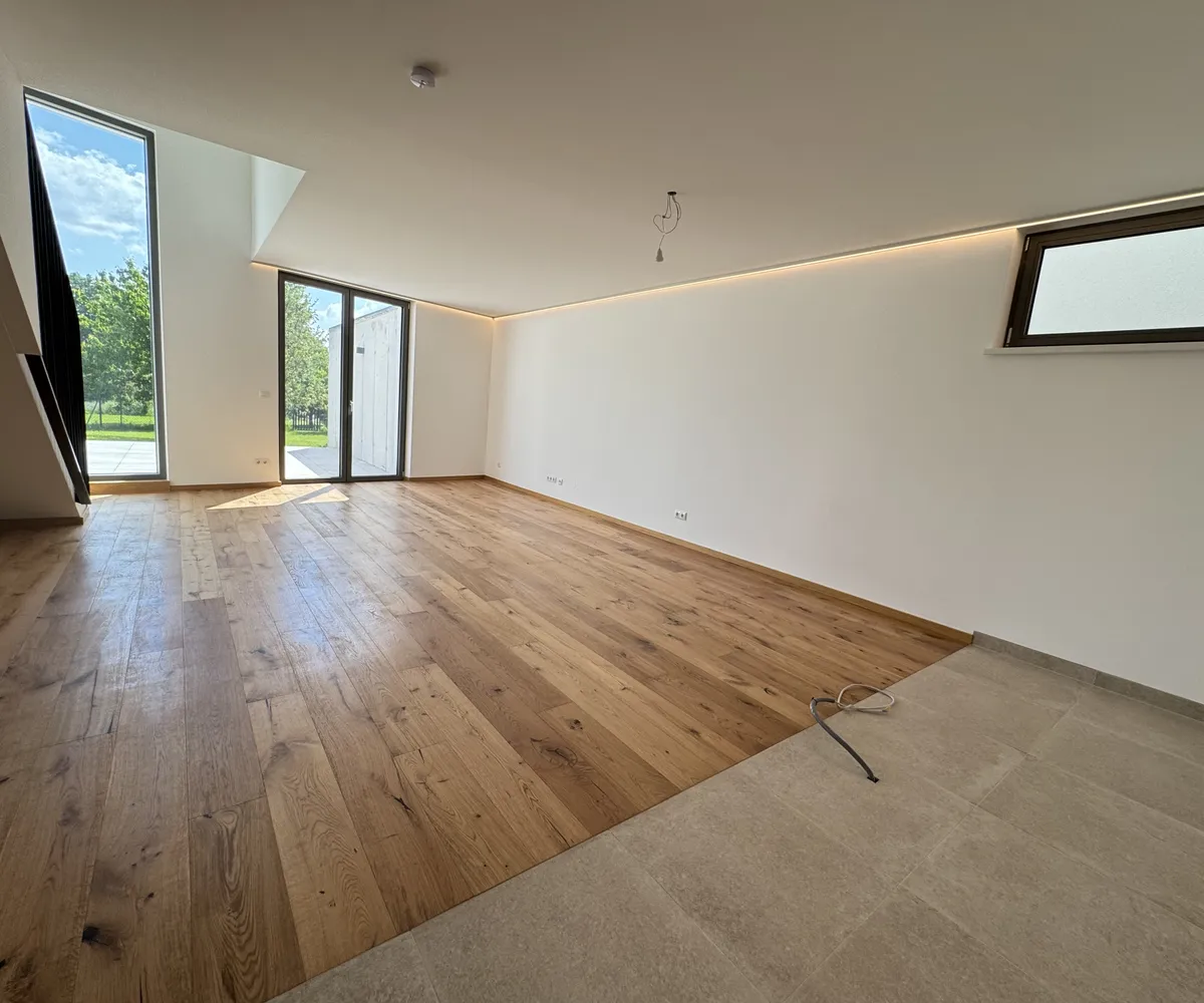 edles Eichenparkett und großformatige Feinsteinzeugfliesen