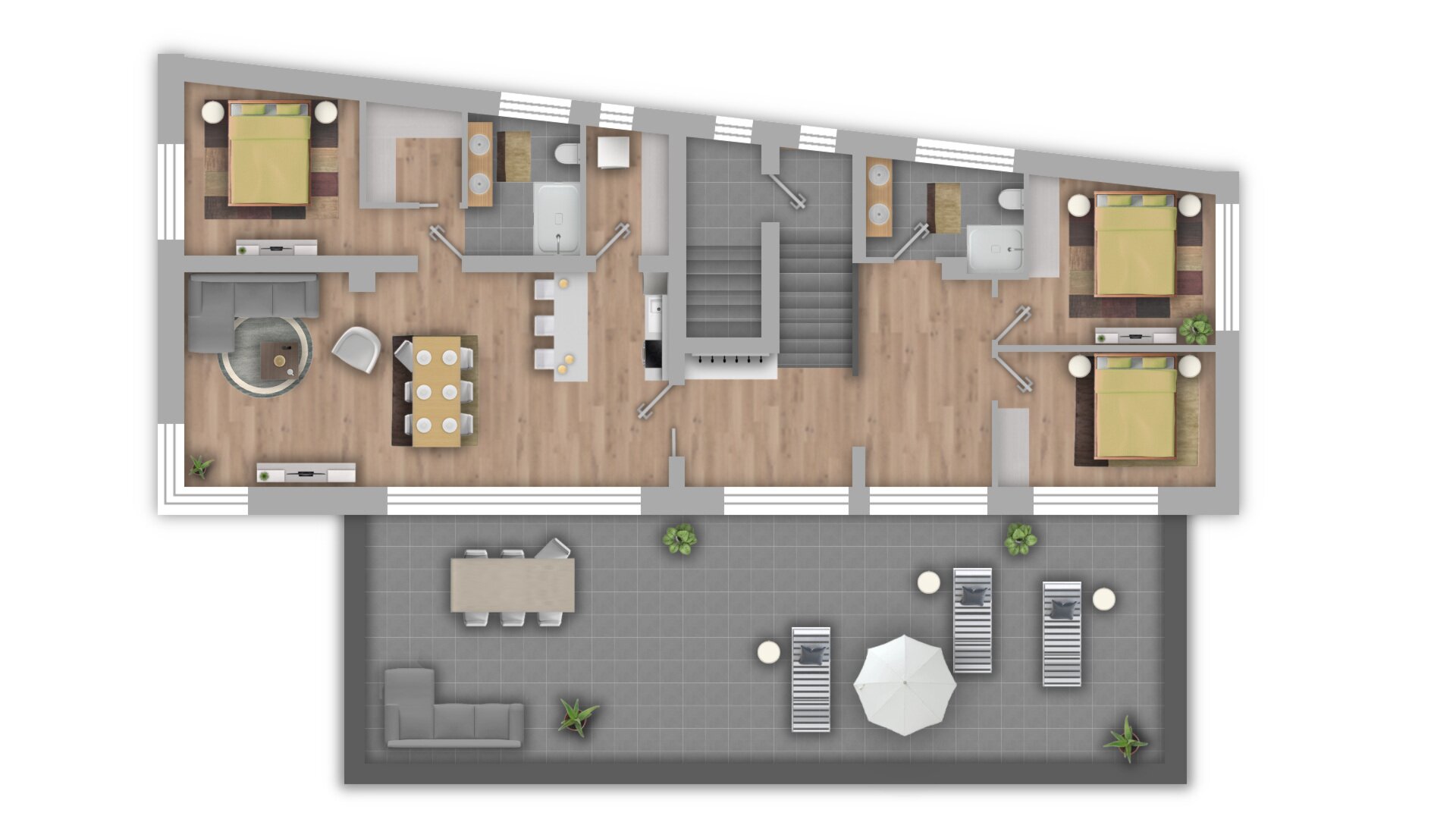 Dieses außergewöhnliche Wohnhaus verbindet modernes Design mit höchstem Wohnkomfort und bietet Ihnen die einmalige Gelegenheit, ein Zuhause nach Ihren persönlichen Vorstellungen zu gestalten. Die Immobilie besteht aus zwei eleganten Einheiten: einer großzügigen Erdgeschosswohnung und einem lichtdurchfluteten Penthouse im Obergeschoss. Optional kann die Erdgeschosswohnung mit einem privaten Pool ausgestattet werden – für entspannte Sommertage direkt vor der eigenen Haustür. Die Wohnungen verfügen über große Terrassen, je einen großzügigen, offenen Wohn-Essbereich, 3 Schlafzimmer und zwei Badezimmer.