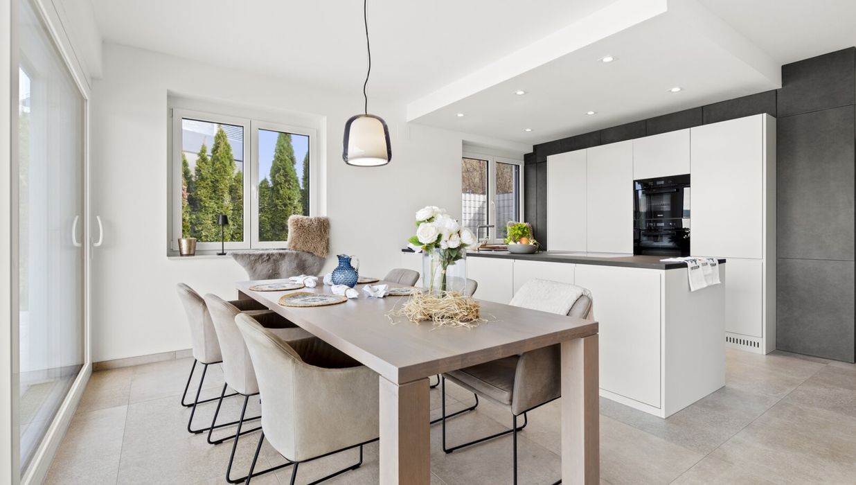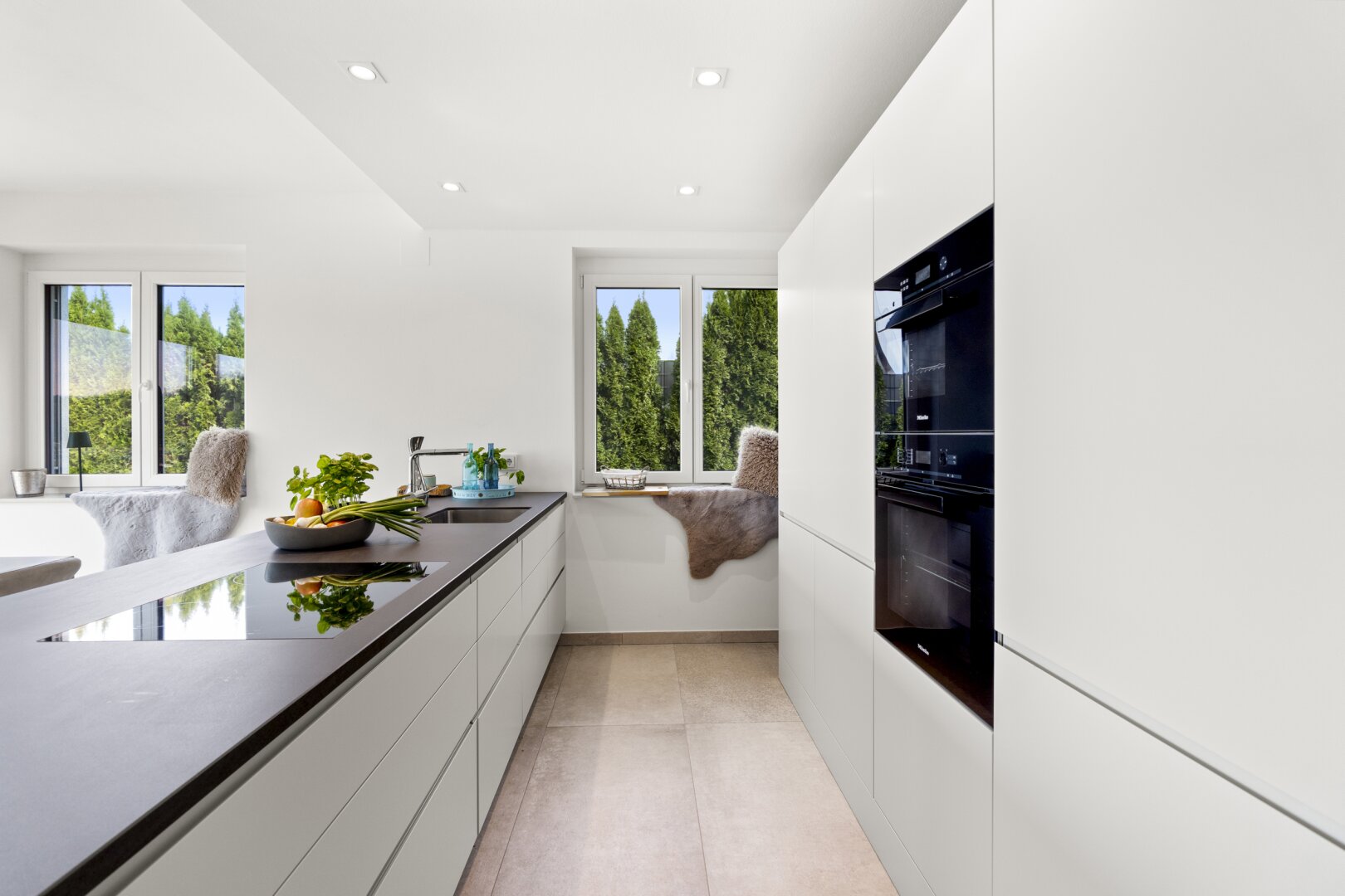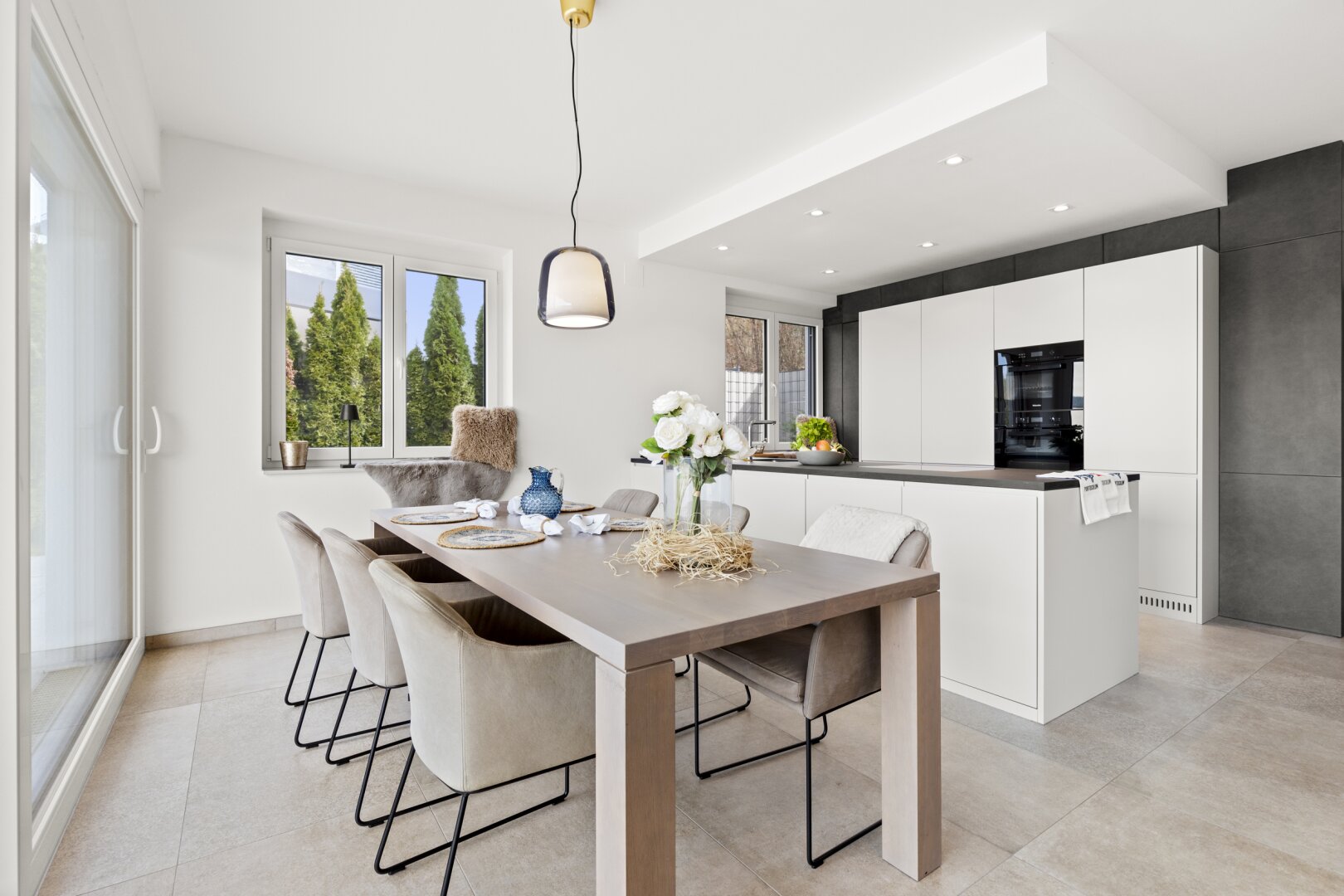 Helle Materialien und große Fensterflächen sorgen für eine wunderbare Lichtdurchflutung.