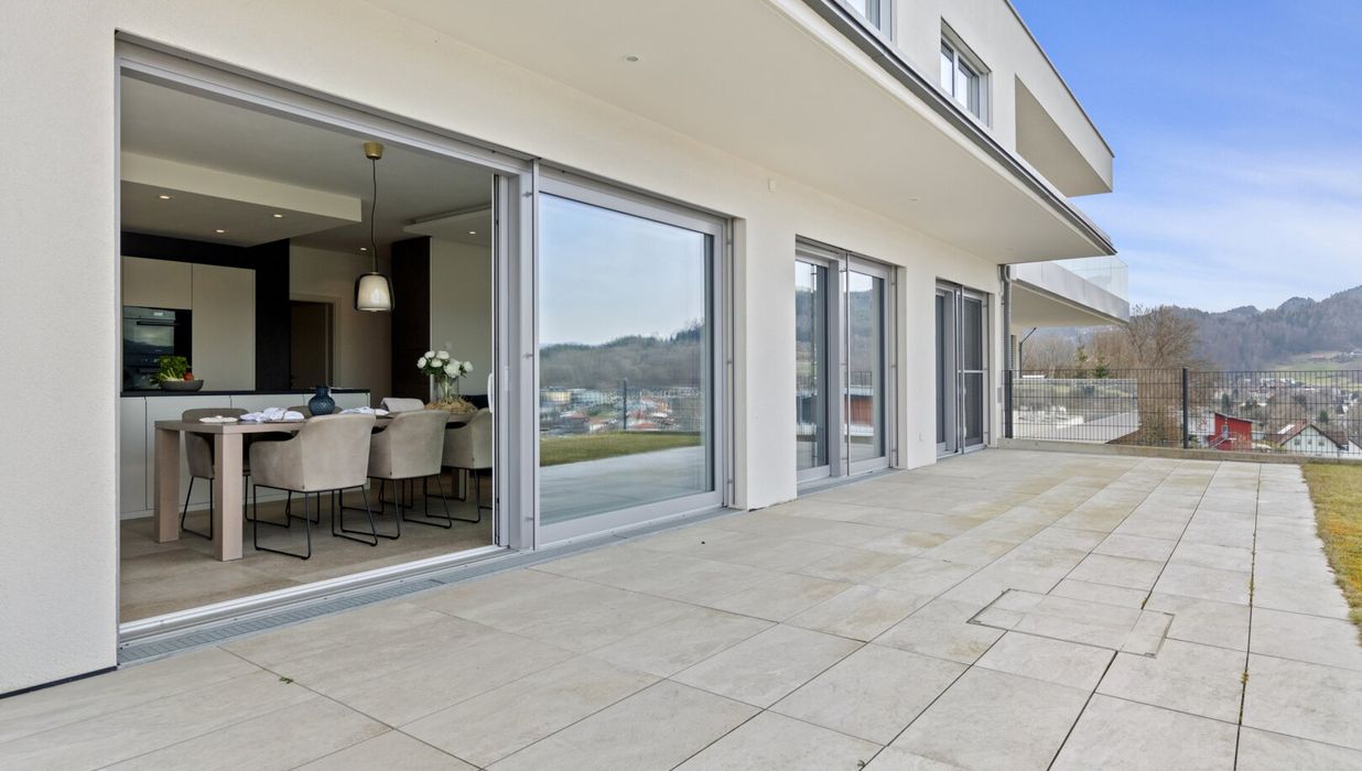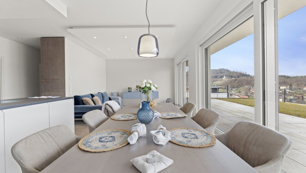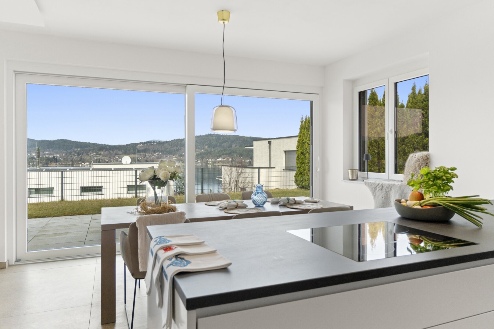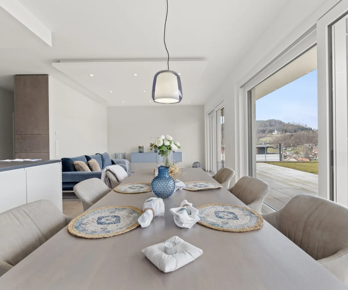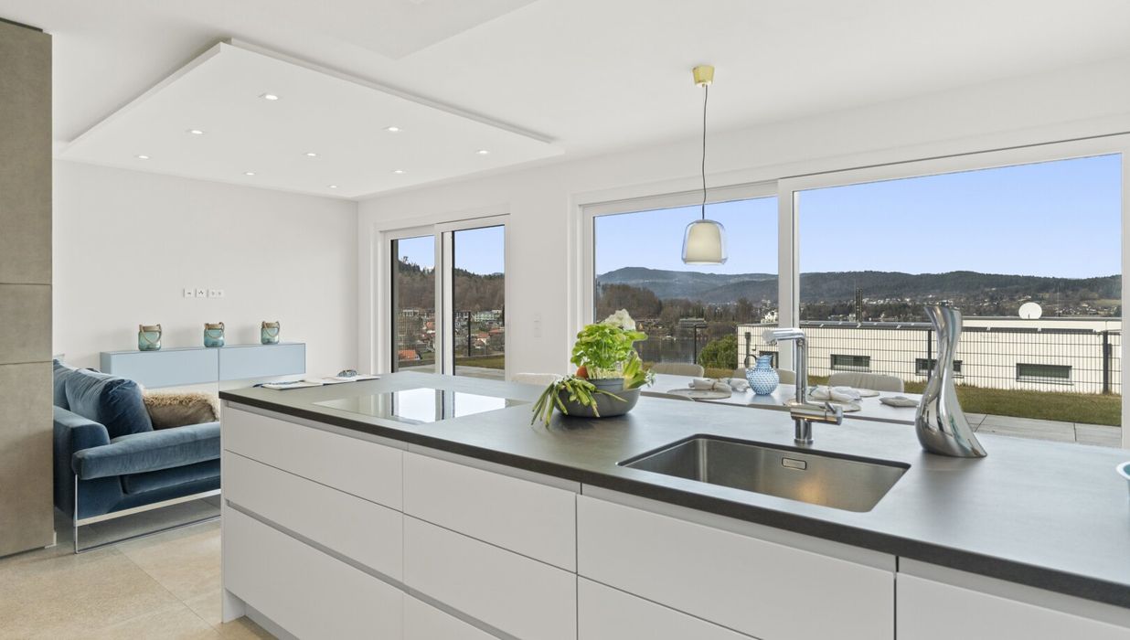 Das Herzstück dieser Seewohnung ist der offene Wohn- und Essbereich, ausgestattet mit einer modernen Küche und einer angrenzenden großzügigen Terrasse.