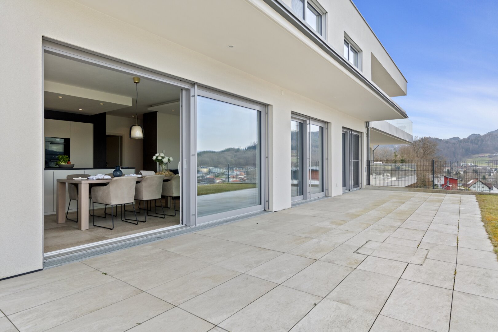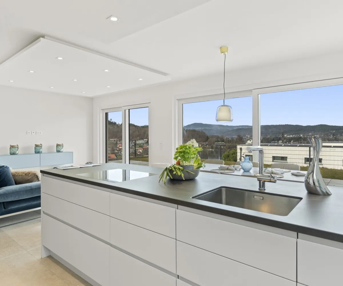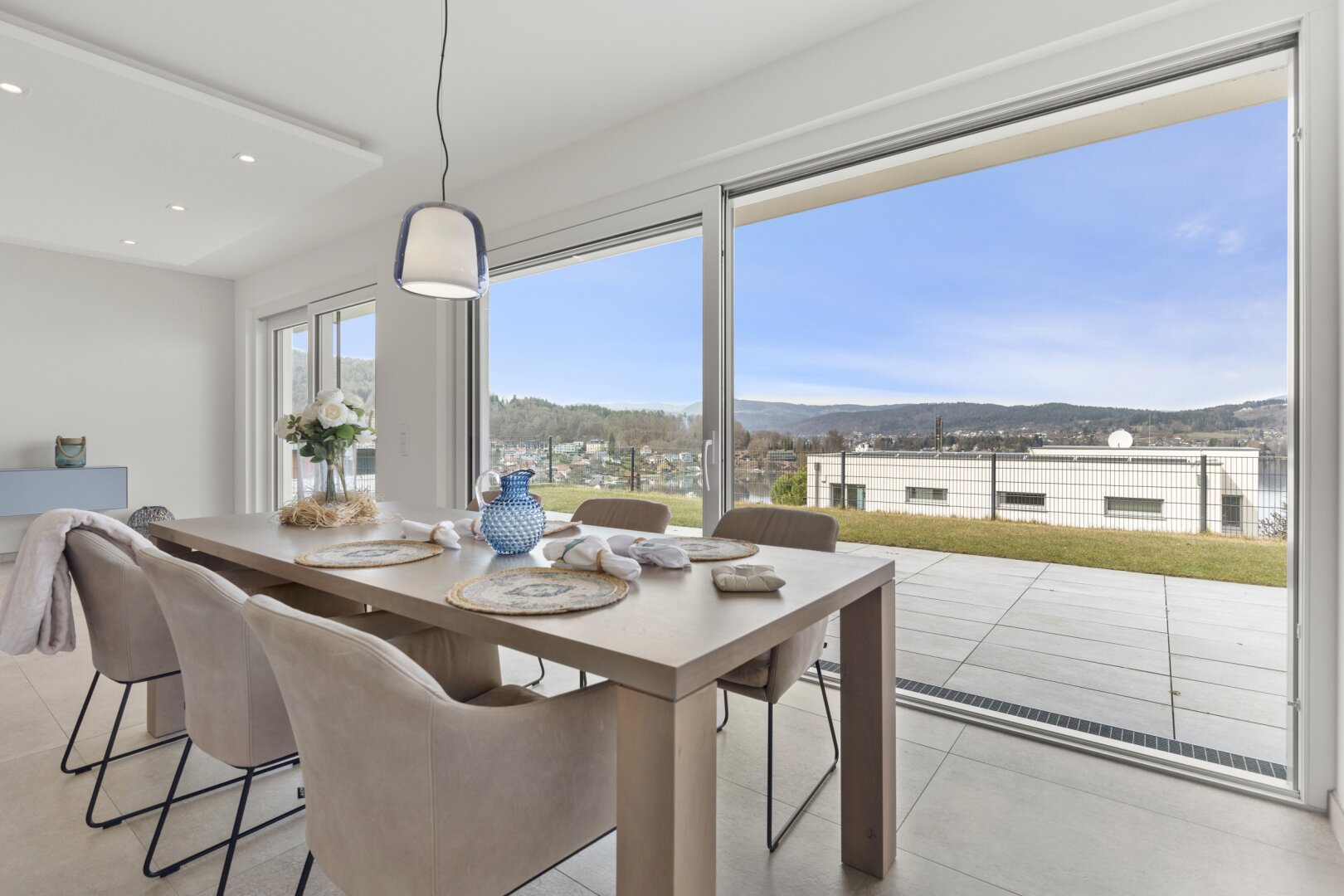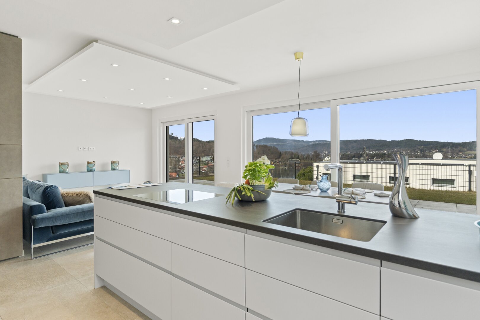 Das Herzstück dieser Seewohnung ist der offene Wohn- und Essbereich, ausgestattet mit einer modernen Küche und einer angrenzenden großzügigen Terrasse.