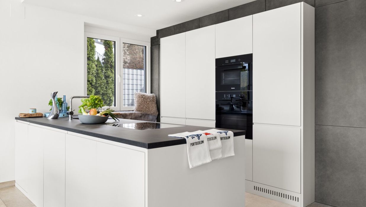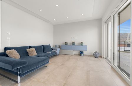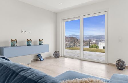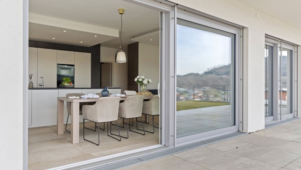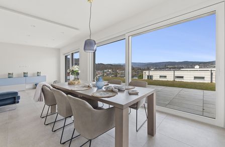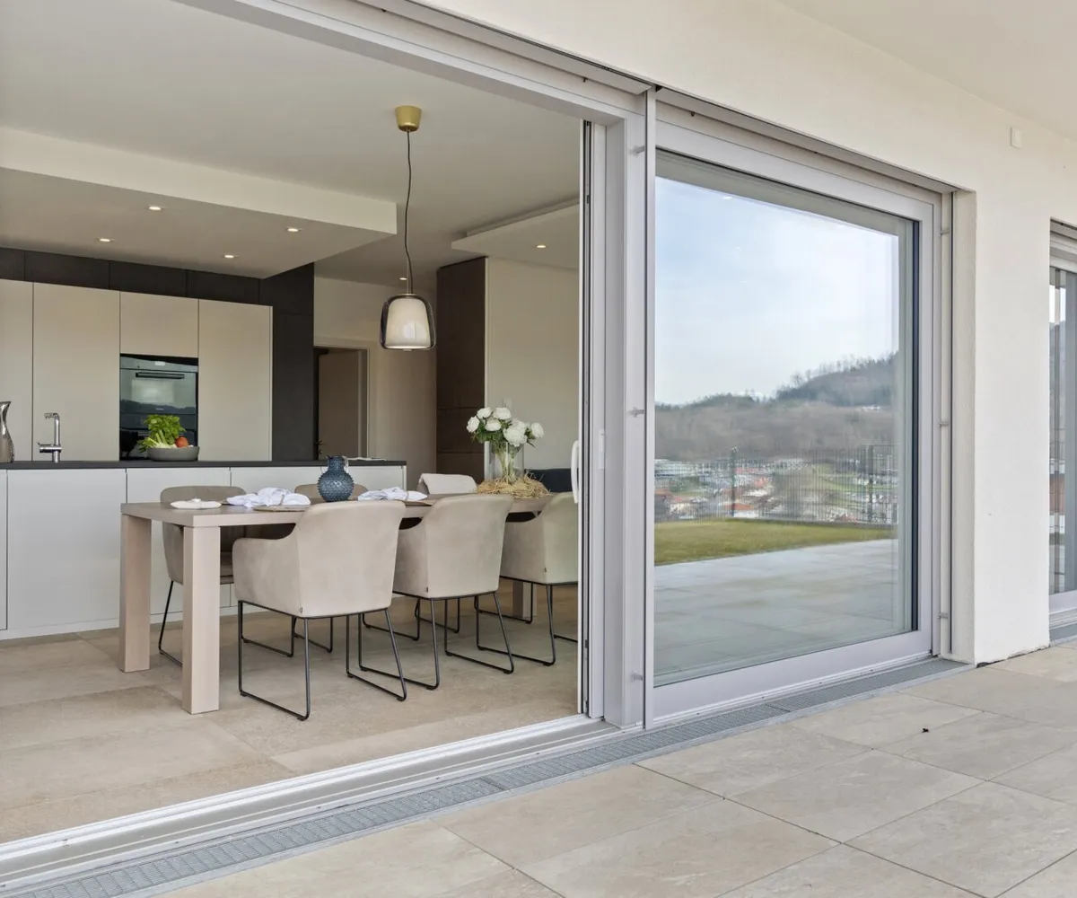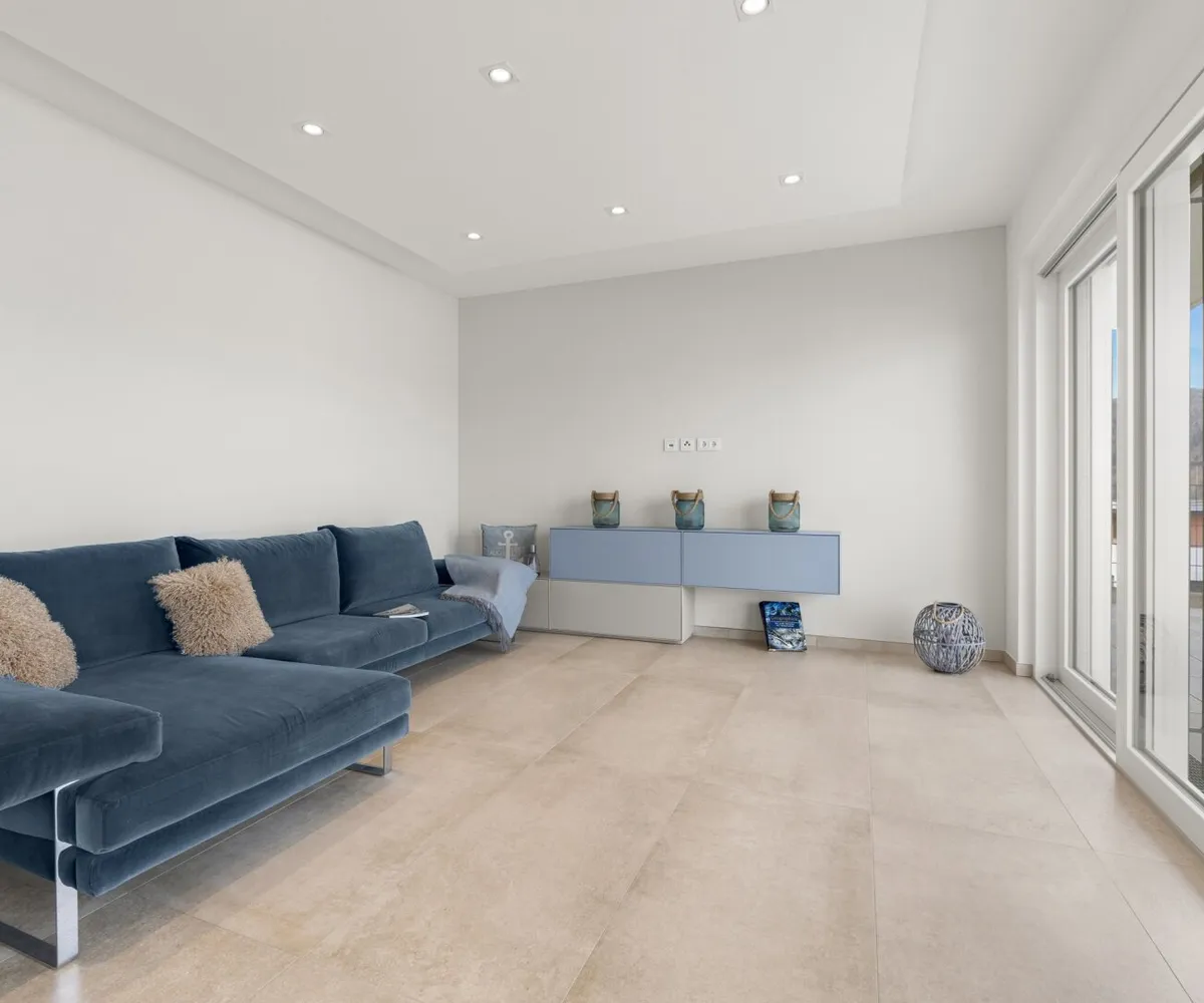 Das Herzstück dieser Seewohnung ist der offene Wohn- und Essbereich, ausgestattet mit einer modernen Küche und einer angrenzenden großzügigen Terrasse.