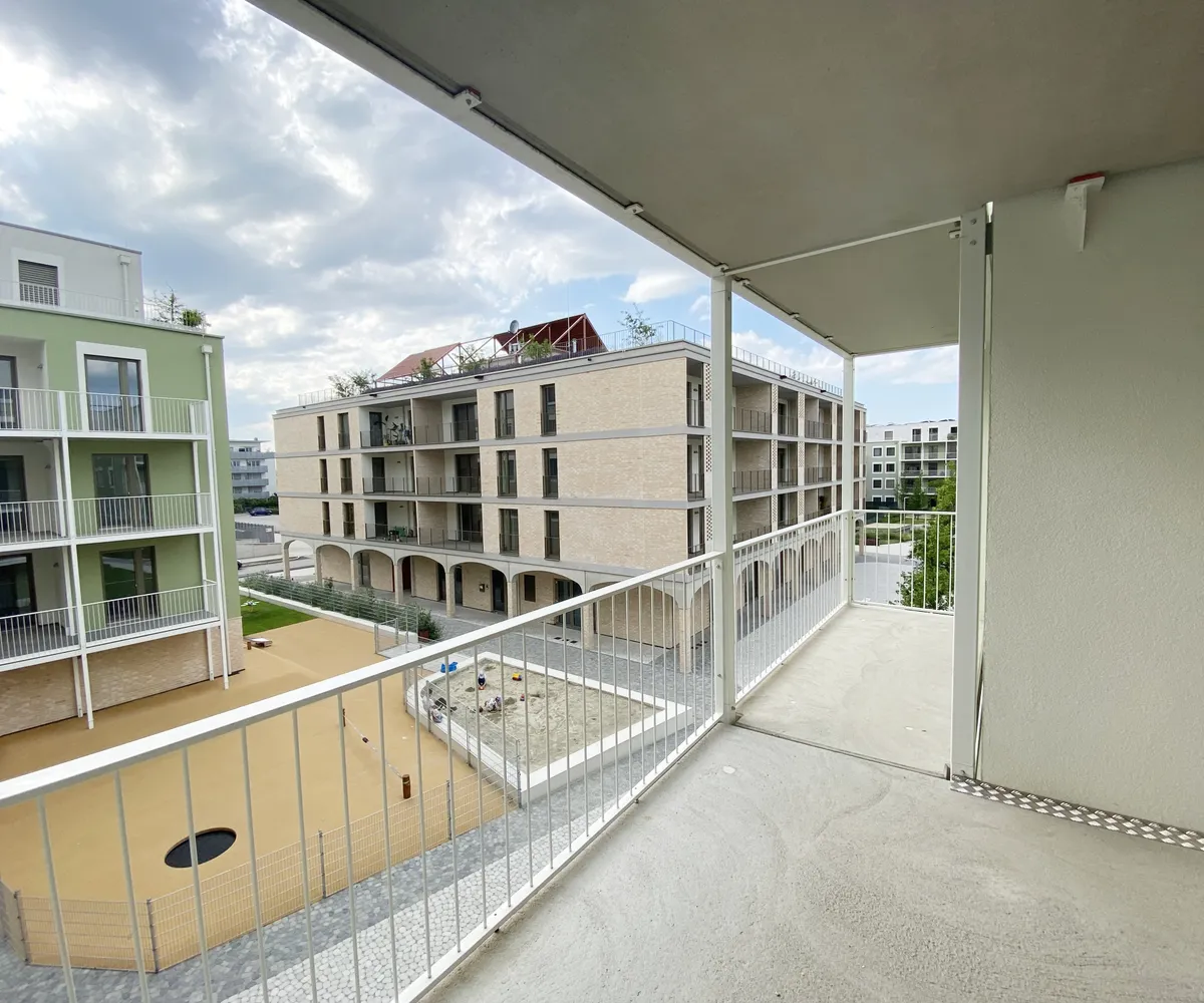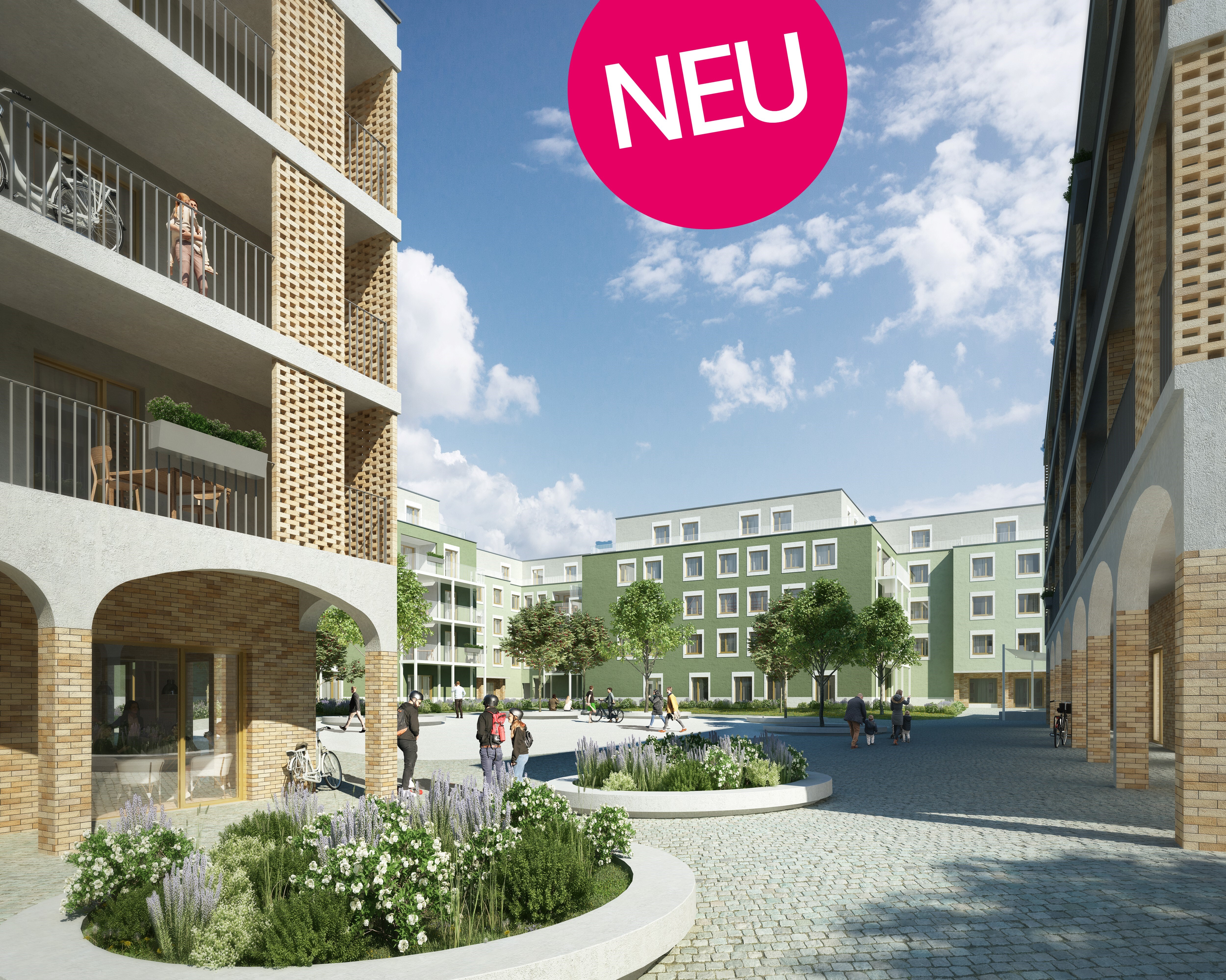 Ein Kindergarten und eine Tagesbetreuungsstätte für Kleinkinder direkt vor Ort machen das Leben besonders für Familien angenehm. Als besonderes Highlight ist ein gemütlicher Café/Hofladen geplant, der als Treffpunkt für Bewohner und Nachbarn dient. Zusätzlich stehen den Bewohnern Aufenthaltsmöglichkeiten auf den Dachflächen zur Verfügung, inklusive beschatteter Sitzmöglichkeiten und hauseigener Hochbeete für den Anbau von Gemüse und Kräutern.