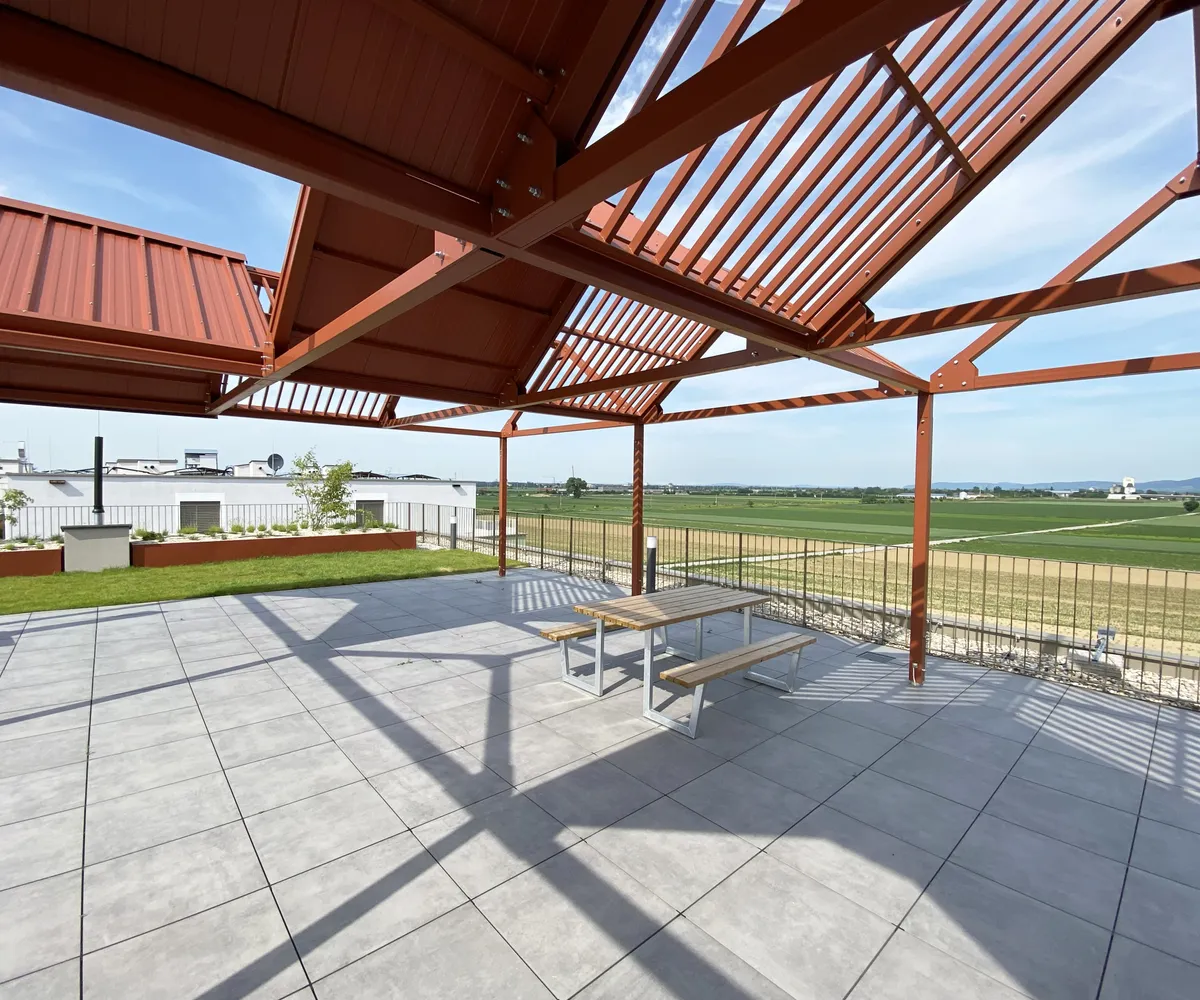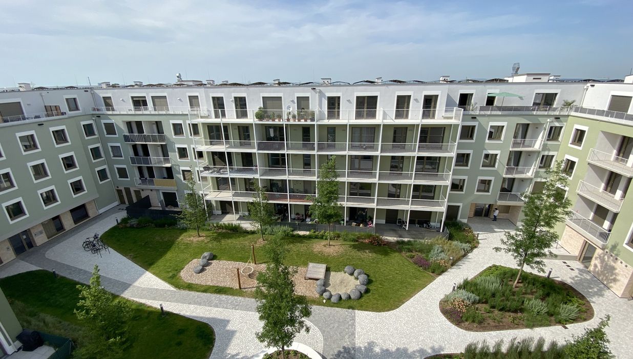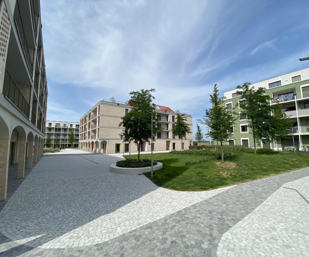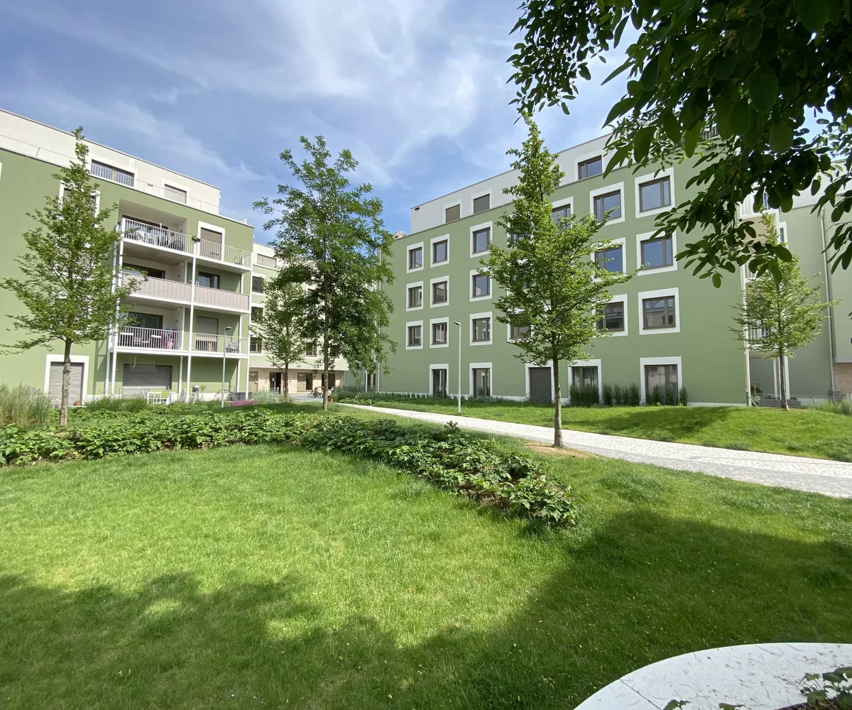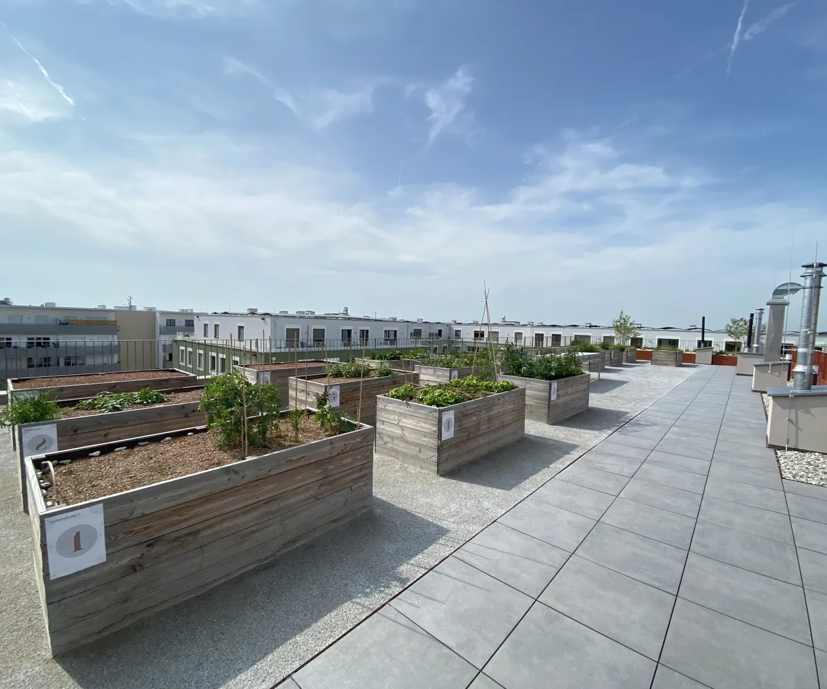 Ein Kindergarten und eine Tagesbetreuungsstätte für Kleinkinder direkt vor Ort machen das Leben besonders für Familien angenehm. Als besonderes Highlight ist ein gemütlicher Café/Hofladen geplant, der als Treffpunkt für Bewohner und Nachbarn dient. Zusätzlich stehen den Bewohnern Aufenthaltsmöglichkeiten auf den Dachflächen zur Verfügung, inklusive beschatteter Sitzmöglichkeiten und hauseigener Hochbeete für den Anbau von Gemüse und Kräutern.