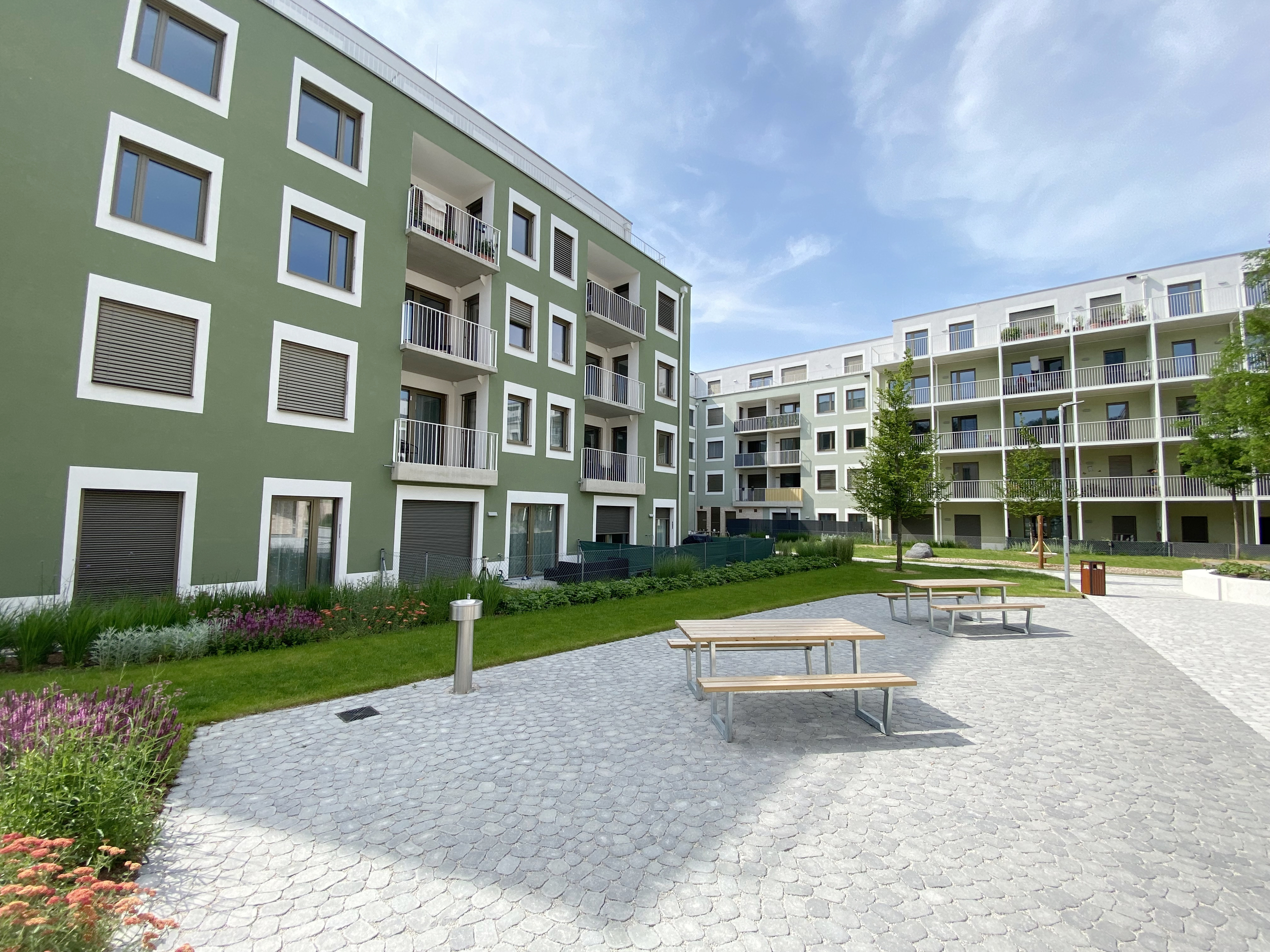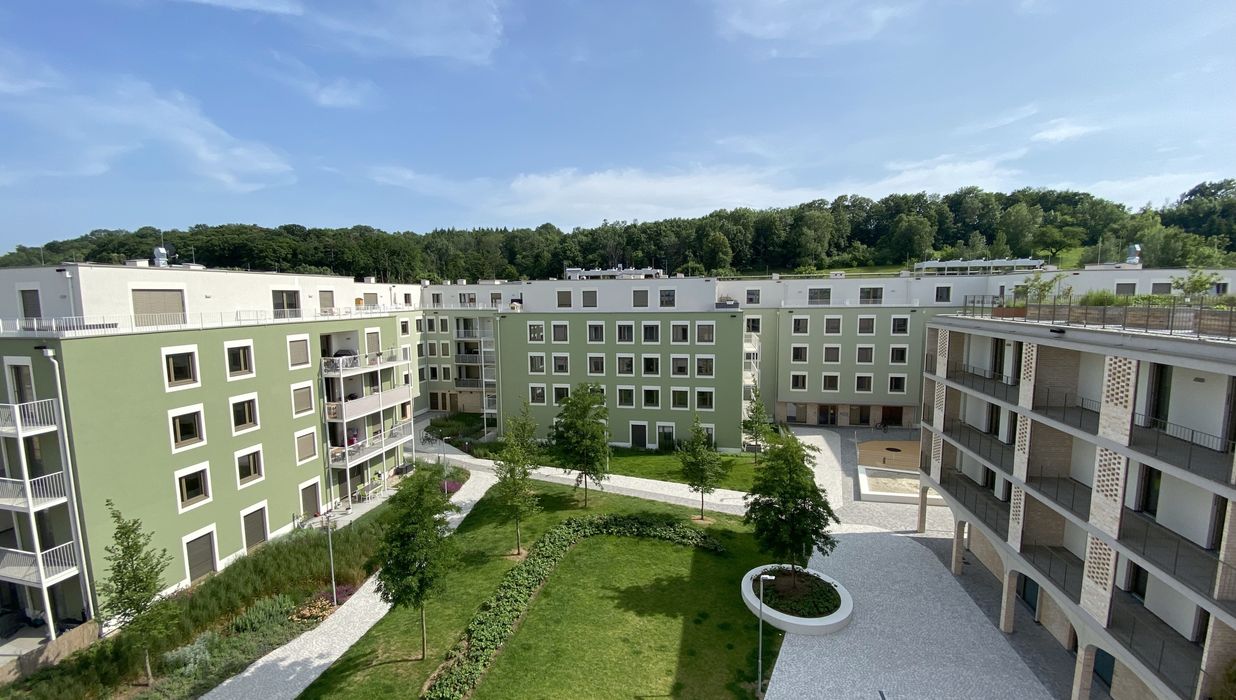 Ein Kindergarten und eine Tagesbetreuungsstätte für Kleinkinder direkt vor Ort machen das Leben besonders für Familien angenehm. Als besonderes Highlight ist ein gemütlicher Café/Hofladen geplant, der als Treffpunkt für Bewohner und Nachbarn dient. Zusätzlich stehen den Bewohnern Aufenthaltsmöglichkeiten auf den Dachflächen zur Verfügung, inklusive beschatteter Sitzmöglichkeiten und hauseigener Hochbeete für den Anbau von Gemüse und Kräutern.