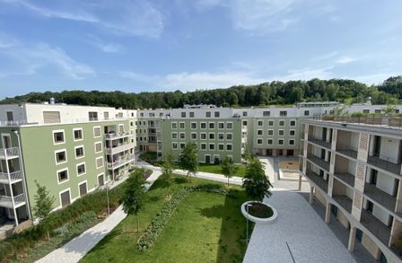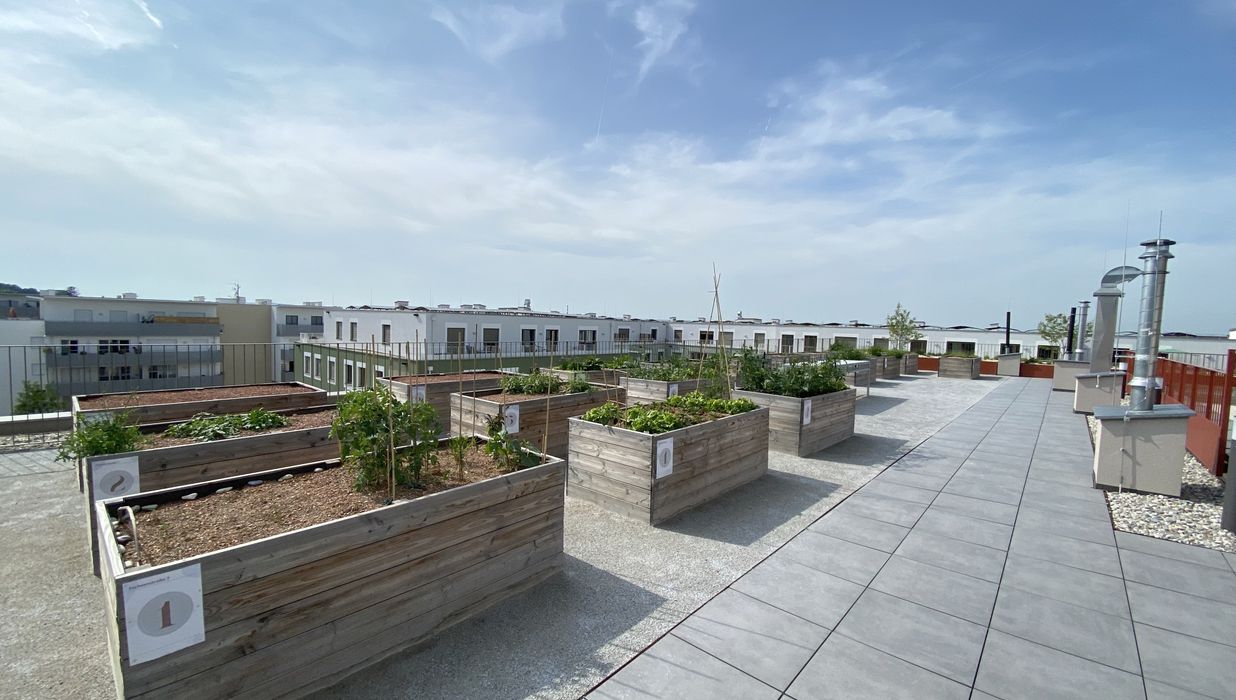 Ein Kindergarten und eine Tagesbetreuungsstätte für Kleinkinder direkt vor Ort machen das Leben besonders für Familien angenehm. Als besonderes Highlight ist ein gemütlicher Café/Hofladen geplant, der als Treffpunkt für Bewohner und Nachbarn dient. Zusätzlich stehen den Bewohnern Aufenthaltsmöglichkeiten auf den Dachflächen zur Verfügung, inklusive beschatteter Sitzmöglichkeiten und hauseigener Hochbeete für den Anbau von Gemüse und Kräutern.