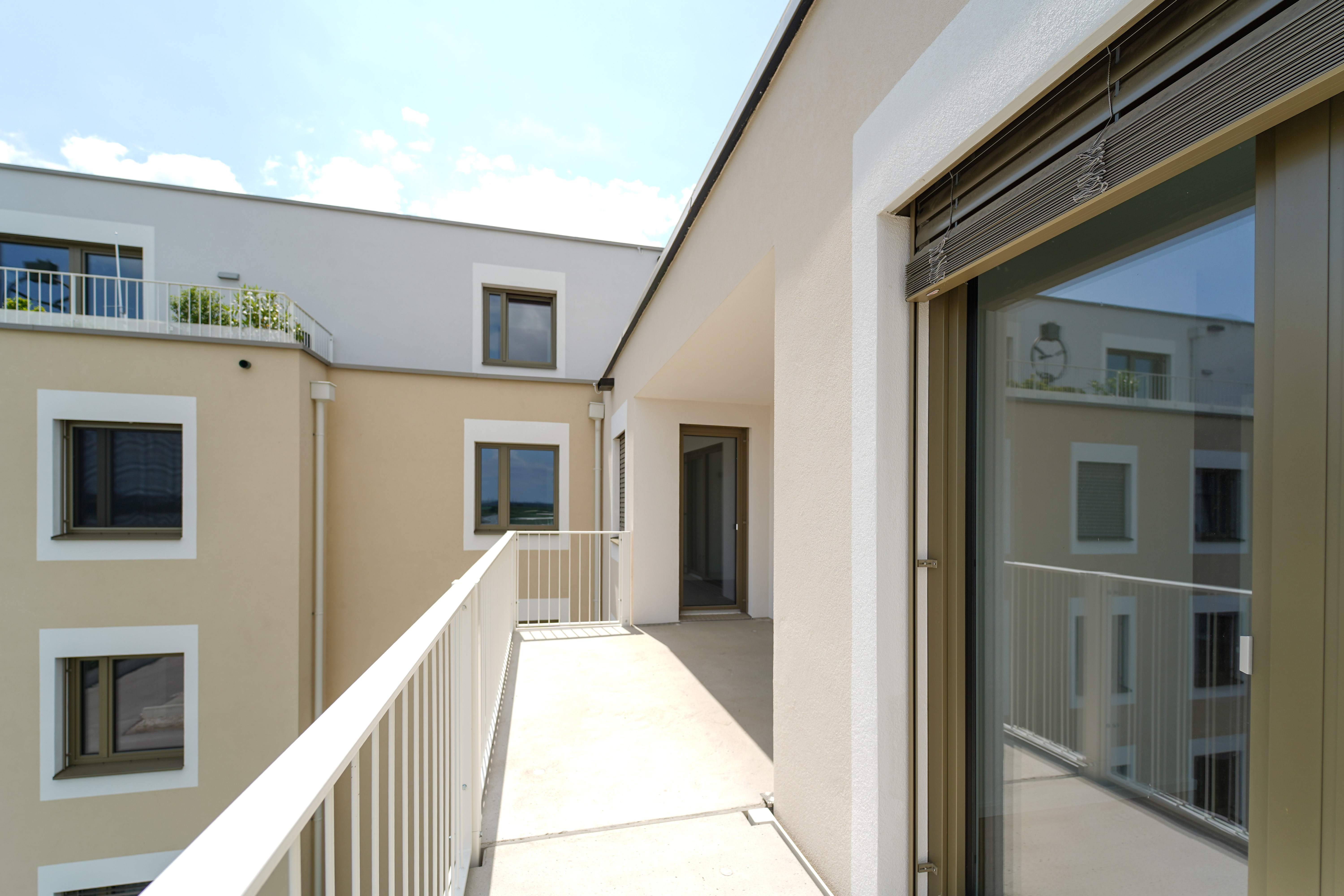 Ein Kindergarten und eine Tagesbetreuungsstätte für Kleinkinder direkt vor Ort machen das Leben besonders für Familien angenehm. Als besonderes Highlight ist ein gemütlicher Café/Hofladen geplant, der als Treffpunkt für Bewohner und Nachbarn dient. Zusätzlich stehen den Bewohnern Aufenthaltsmöglichkeiten auf den Dachflächen zur Verfügung, inklusive beschatteter Sitzmöglichkeiten und hauseigener Hochbeete für den Anbau von Gemüse und Kräutern.