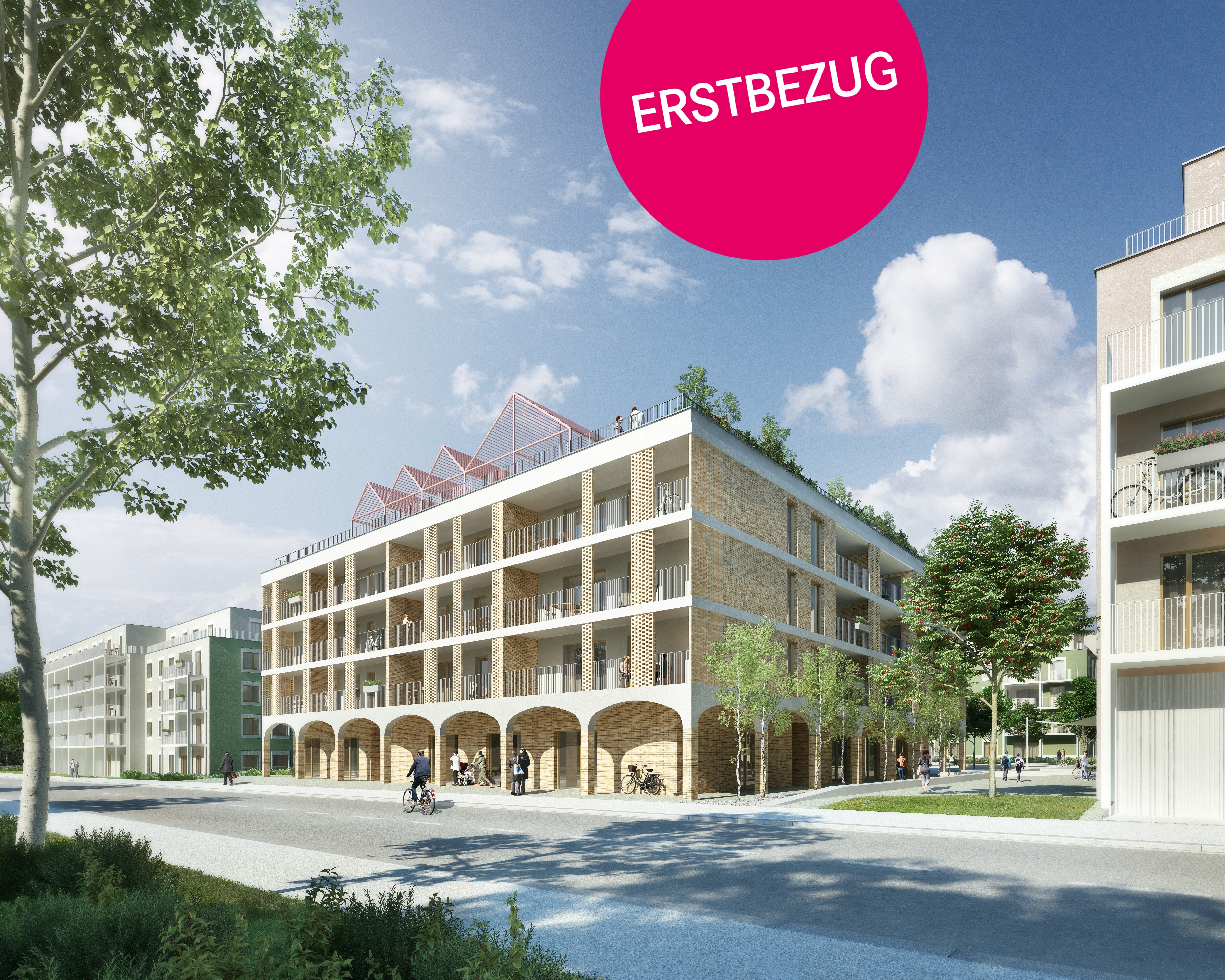 Ein Kindergarten und eine Tagesbetreuungsstätte für Kleinkinder direkt vor Ort machen das Leben besonders für Familien angenehm. Als besonderes Highlight ist ein gemütlicher Café/Hofladen geplant, der als Treffpunkt für Bewohner und Nachbarn dient. Zusätzlich stehen den Bewohnern Aufenthaltsmöglichkeiten auf den Dachflächen zur Verfügung, inklusive beschatteter Sitzmöglichkeiten und hauseigener Hochbeete für den Anbau von Gemüse und Kräutern.