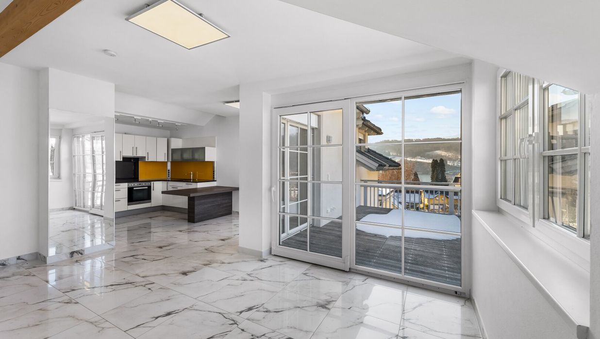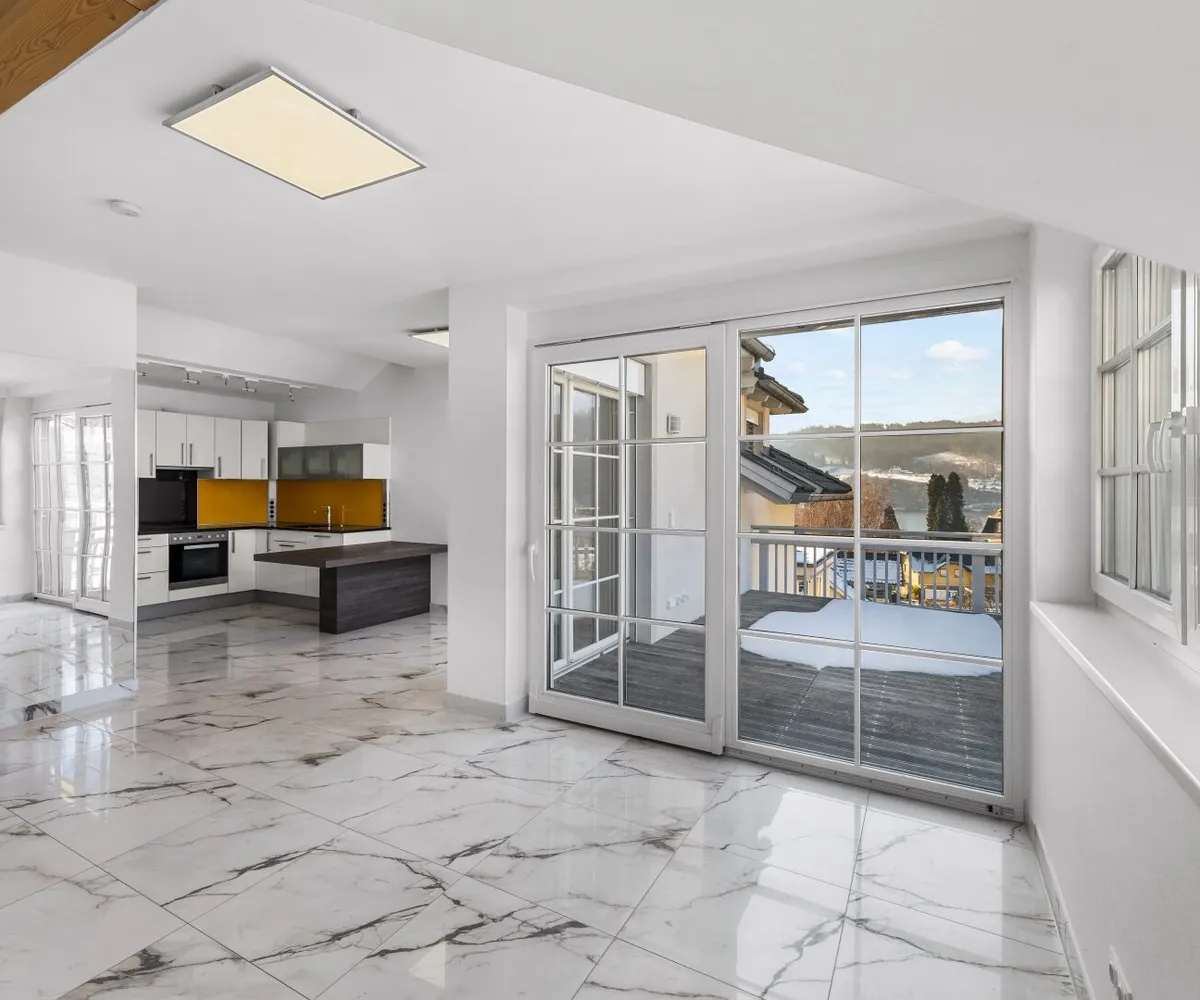 Eine sehr gute Raumaufteilung, die großzügige Terrasse mit Blick auf den See und ins Bergpanorama, und die Parkmöglichkeit am eigenen Tiefgaragenplatz (dieser ist mit einem Preis von € 15.000,-- mitzukaufen) garantieren eine bequeme Nutzung dieser Wohnung. Die Versorgung mit Fernwärmeenergie und eine Bodenheizung in allen Räumen schließt sich nahtlos an diese Bequemlichkeit an.