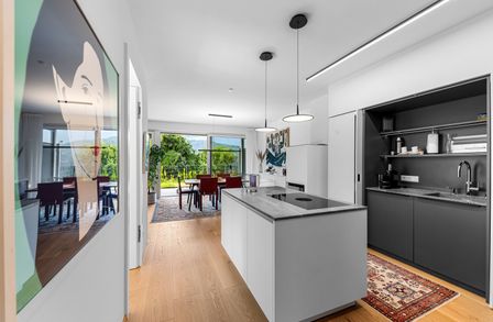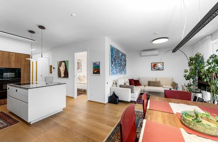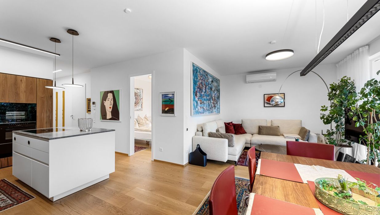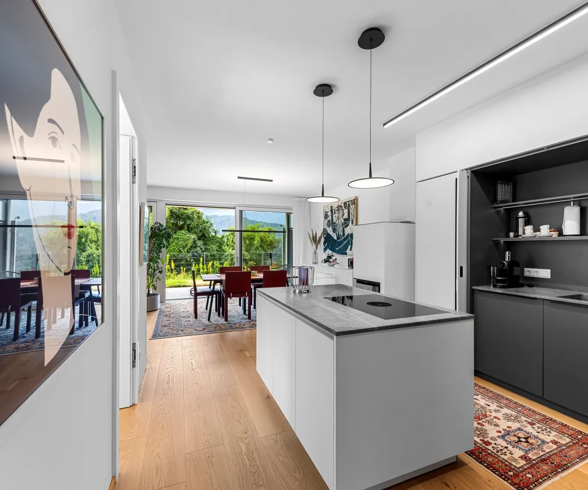 Eine sehr gute und individuell angepasste Raumaufteilung, eine großzügige Terrasse mit Blick auf den See und ins Bergpanorama mit einer zusätzlich begrünten Terrasse sowie die Parkmöglichkeiten auf den beiden eigenen Tiefgaragenplätzen (diese sind mit einem Preis von € 40.000,-- mitzukaufen) garantieren eine sehr bequeme Nutzung dieses Luxusapartments.