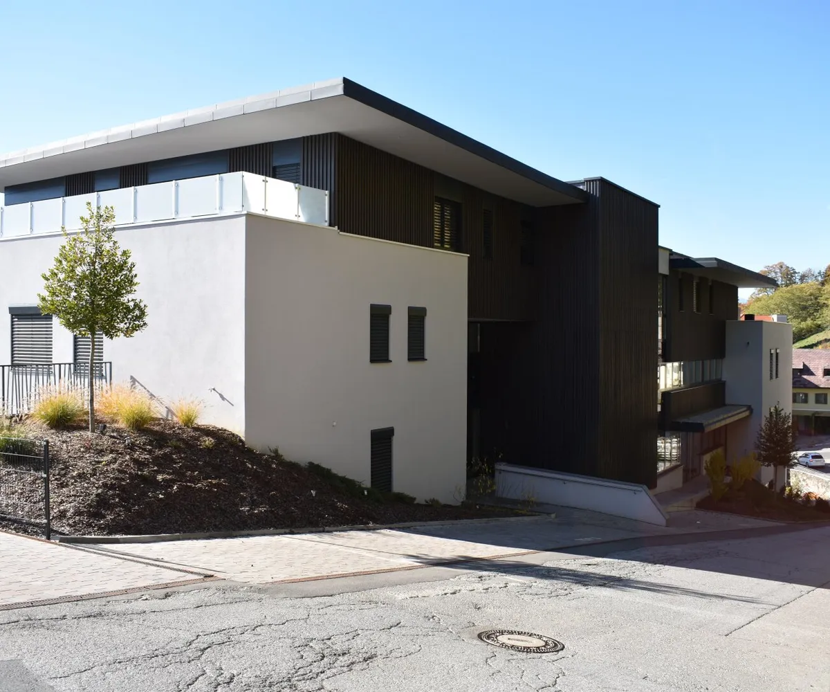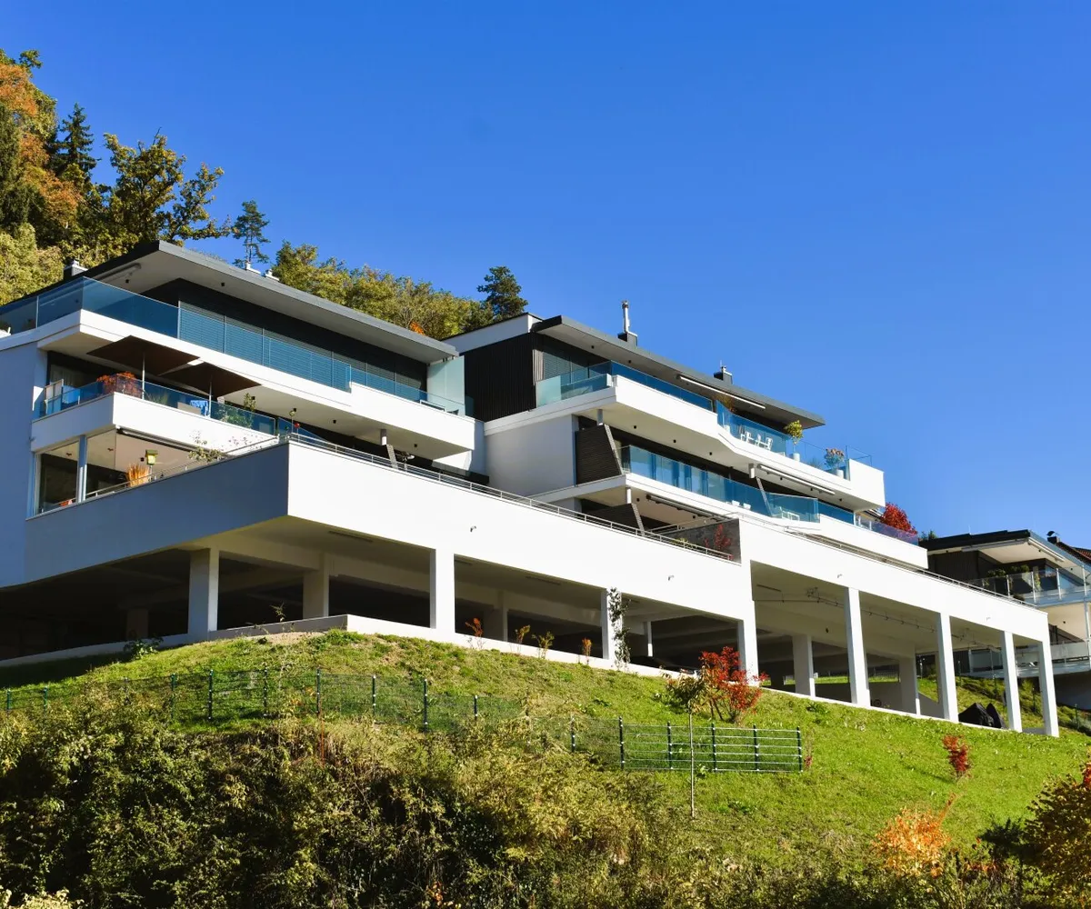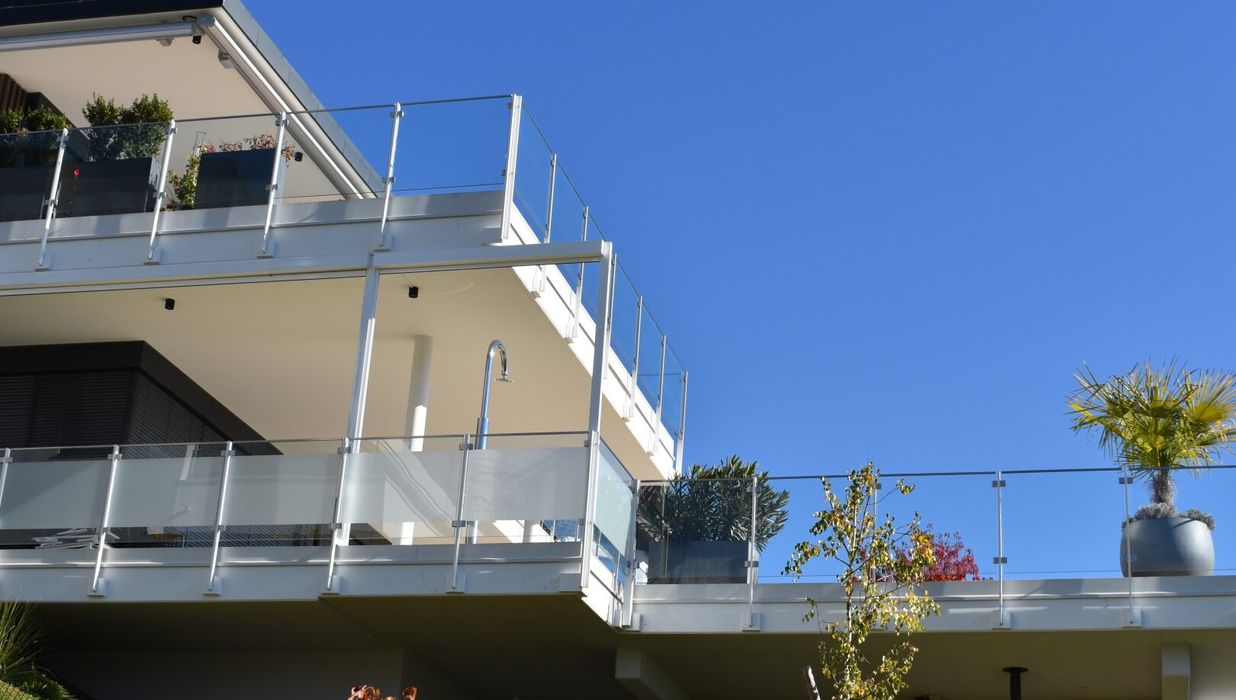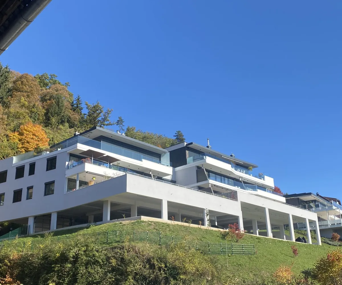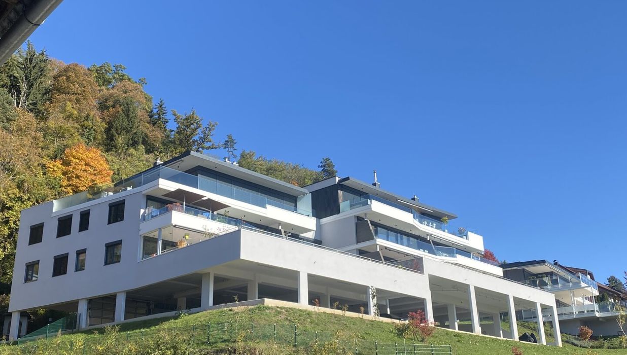 Eine Dreifach verglaste Holz-/Aluminium Fensterkonstruktion mit raumhohen Verglasungen und großen Hebe-Schiebefenstern verschafft die gewünschte Offenheit und lichtdurchflutete Räume. Die Vordächer und auskragenden Terrassen sorgen neben elektrischen Raffstores für eine natürliche Verschattung. Parkettböden und Feinsteinzeug mit Fußbodenheizung sorgt für ein angenehmes Wohnklima während die großzügige Sonnenterrasse Erholung und Entspannung pur bietet.