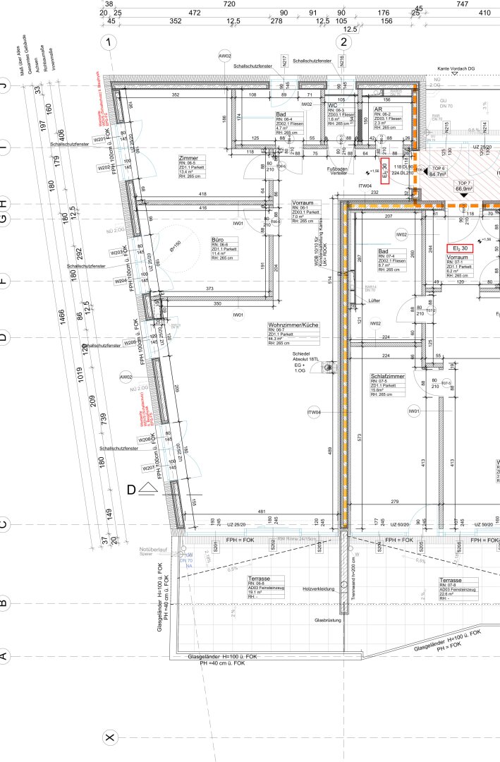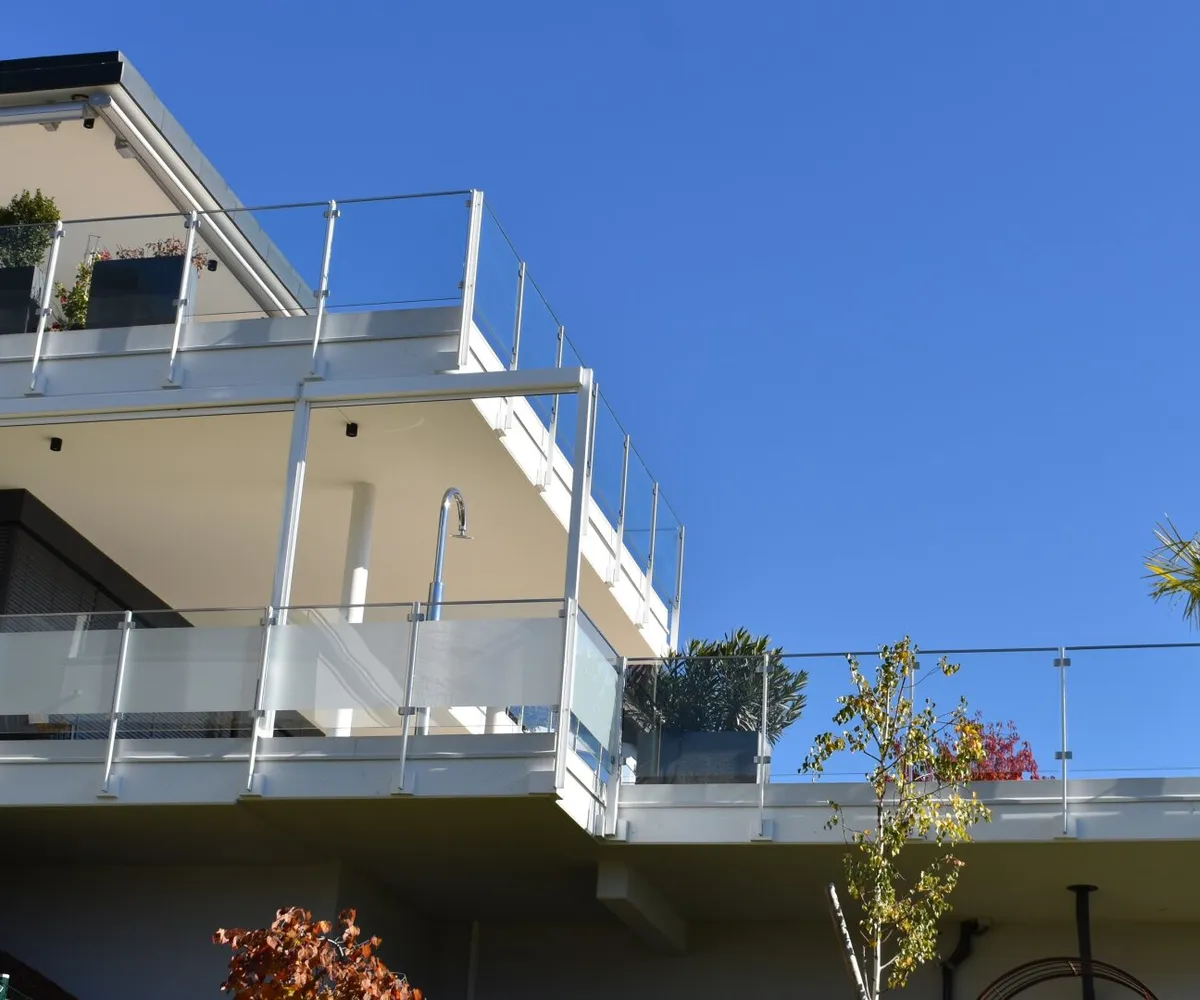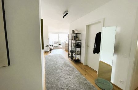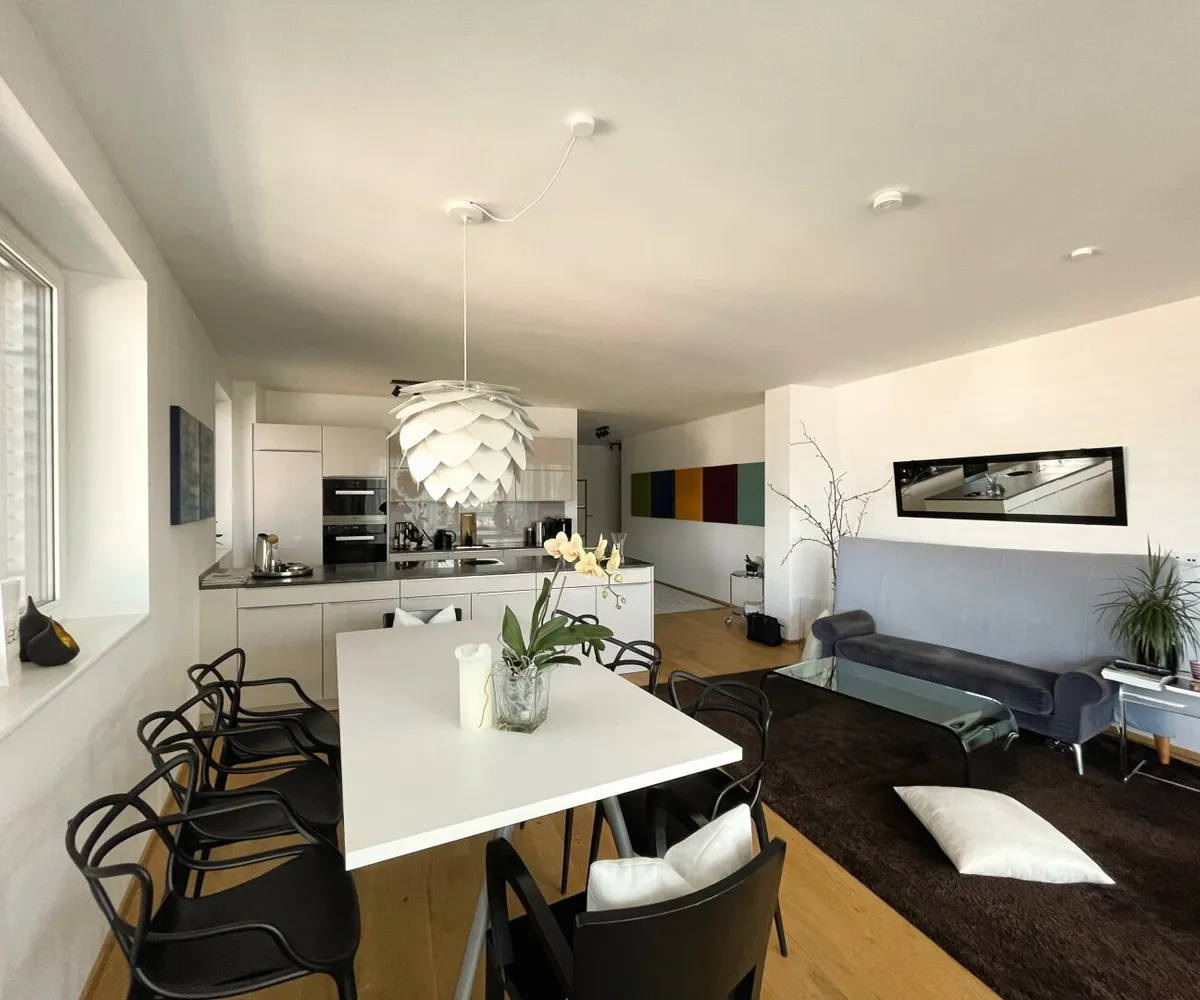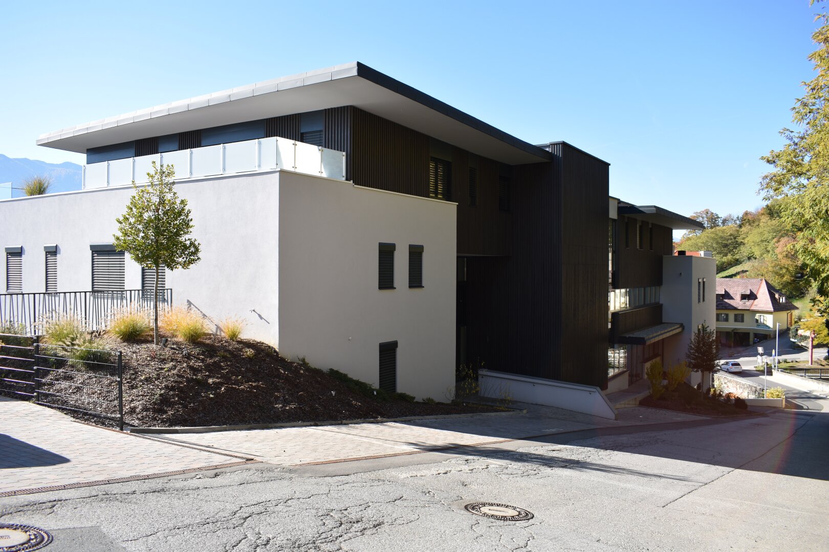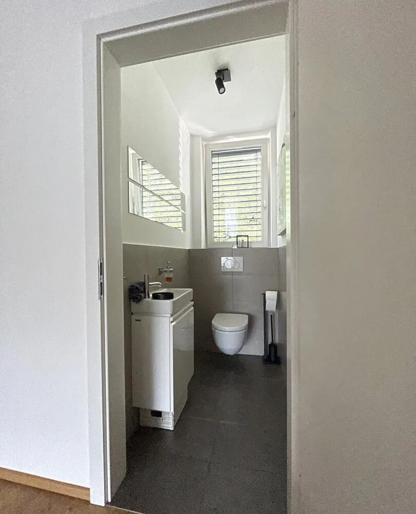 Eine Dreifach verglaste Holz-/Aluminium Fensterkonstruktion mit raumhohen Verglasungen und großen Hebe-Schiebefenstern verschafft die gewünschte Offenheit und lichtdurchflutete Räume. Die Vordächer und auskragenden Terrassen sorgen neben elektrischen Raffstores für eine natürliche Verschattung. Parkettböden und Feinsteinzeug mit Fußbodenheizung sorgt für ein angenehmes Wohnklima während die großzügige Sonnenterrasse Erholung und Entspannung pur bietet.
