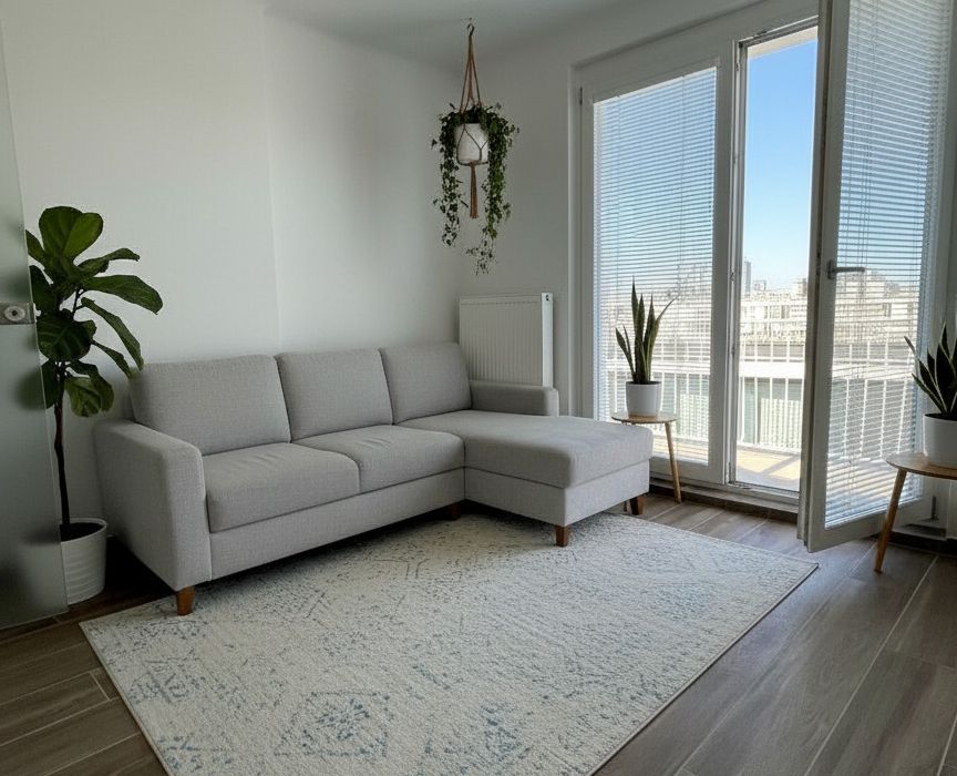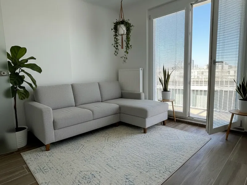 Schlafzimmer und Wohnzimmer haben je einen Balkon vorgelagert und Sie genießen einen herrlichen Fernblick nach Osten und Süden. Die Einrichtung wurde beispielhaft KI-generiert.
