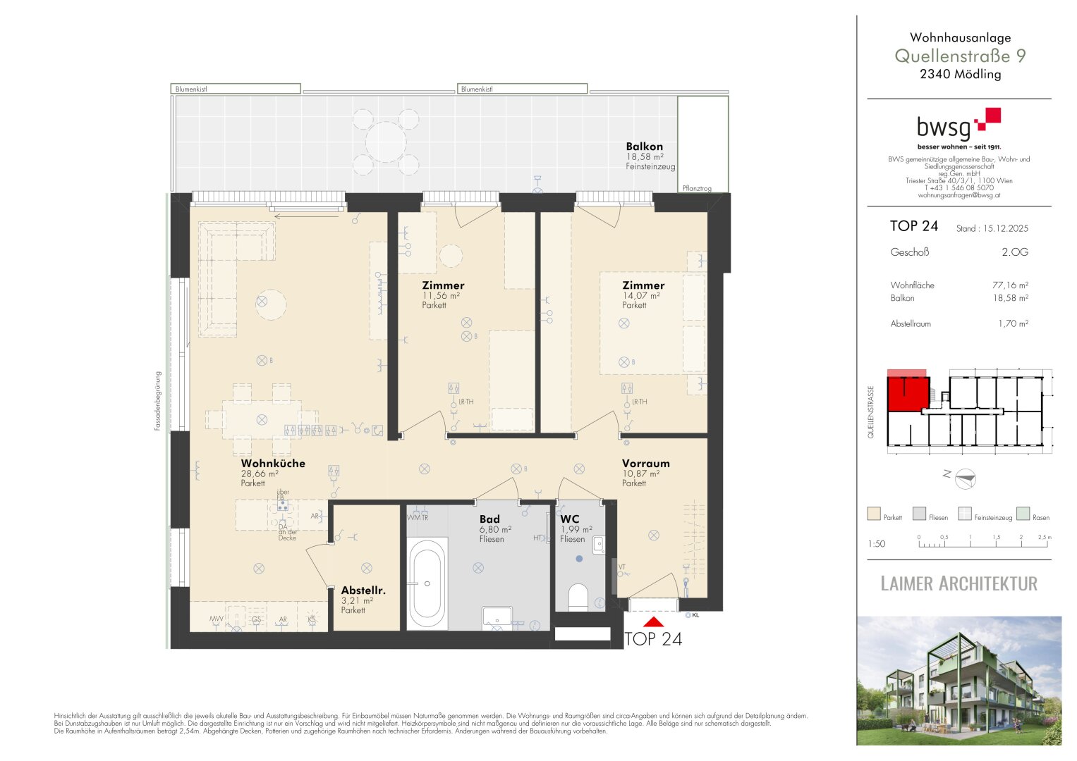 Die Wohnanlage punktet aber auch mit durchdachten Details: Ein Fahrrad- und Kinderwagenabstellplatz sowie barrierefreie Liftanlagen sorgen für ein Plus an Komfort. Für umweltbewusste Mobilität steht eine eigene E-Ladestation zur Verfügung. Die Wohnungen werden über ein energieeffizientes Fernwärmesystem beheizt, das niedrige Betriebskosten und nachhaltiges Wohnen ermöglicht.