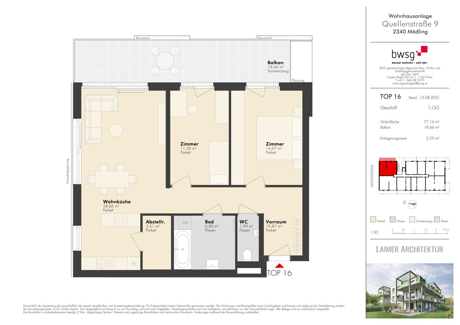 Die Wohnanlage punktet aber auch mit durchdachten Details: Ein Fahrrad- und Kinderwagenabstellplatz sowie barrierefreie Liftanlagen sorgen für ein Plus an Komfort. Für umweltbewusste Mobilität steht eine eigene E-Ladestation zur Verfügung. Die Wohnungen werden über ein energieeffizientes Fernwärmesystem beheizt, das niedrige Betriebskosten und nachhaltiges Wohnen ermöglicht.