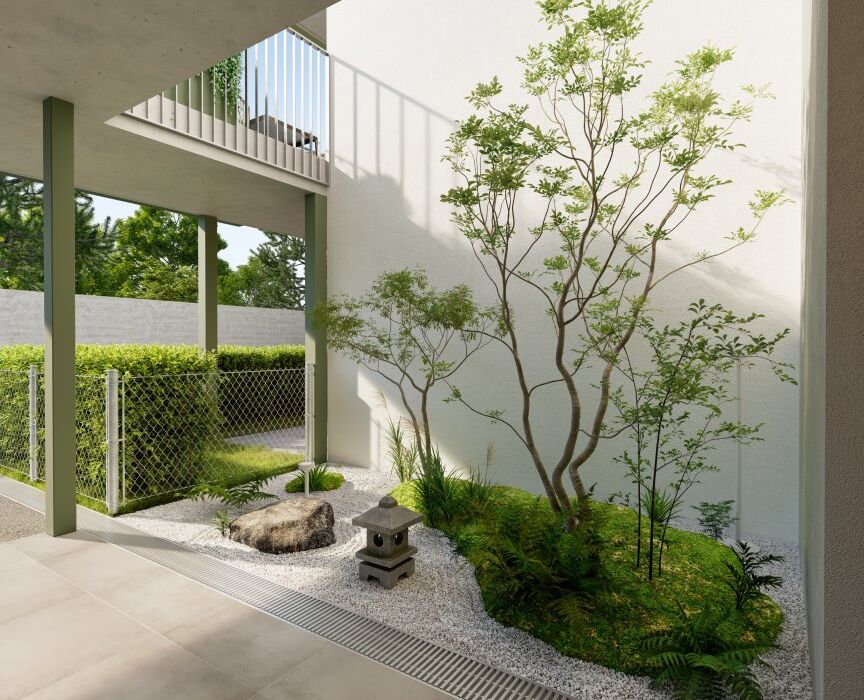 Die Anlage ist in Quaderform gestaltet und wird von begrünten Fassaden und einem Gründach ummantelt. Vor dem Eingang wird ein japanischer Garten den Eingang zieren, der mit Kieswegen, stilvollen Pflanzen und ruhigen Gestaltungselementen eine besondere Atmosphäre schafft. Die Freiflächen bestehen aus Terrassen, Balkonen und Eigengärten. Im grünen Innenhof ist ein Naturspielplatz vorgesehen und eine Gemeinschaftsgarten. Begrünte Fassaden und ein ökologisches Gründach tragen zu einem angenehmen Mikroklima bei.