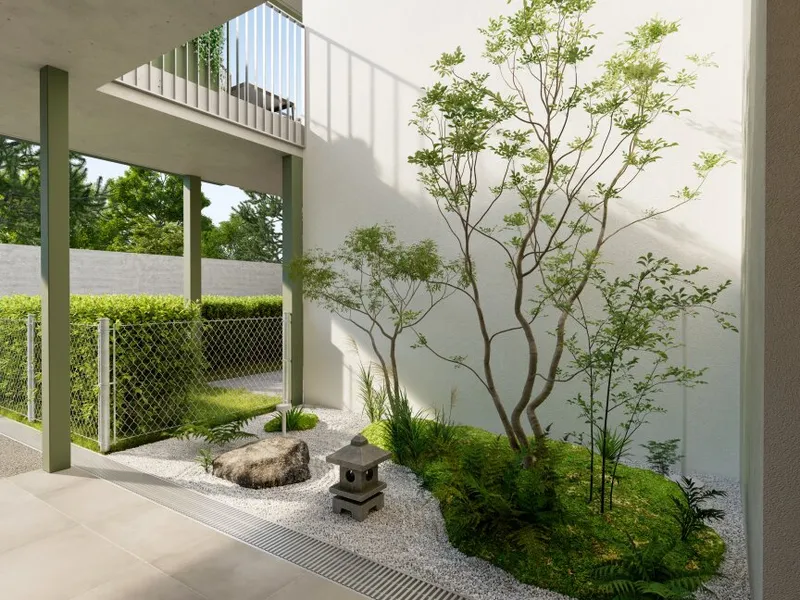 Die Anlage ist in Quaderform gestaltet und wird von begrünten Fassaden und einem Gründach ummantelt. Vor dem Eingang wird ein japanischer Garten den Eingang zieren, der mit Kieswegen, stilvollen Pflanzen und ruhigen Gestaltungselementen eine besondere Atmosphäre schafft. Die Freiflächen bestehen aus Terrassen, Balkonen und Eigengärten. Im grünen Innenhof ist ein Naturspielplatz vorgesehen und eine Gemeinschaftsgarten. Begrünte Fassaden und ein ökologisches Gründach tragen zu einem angenehmen Mikroklima bei.
