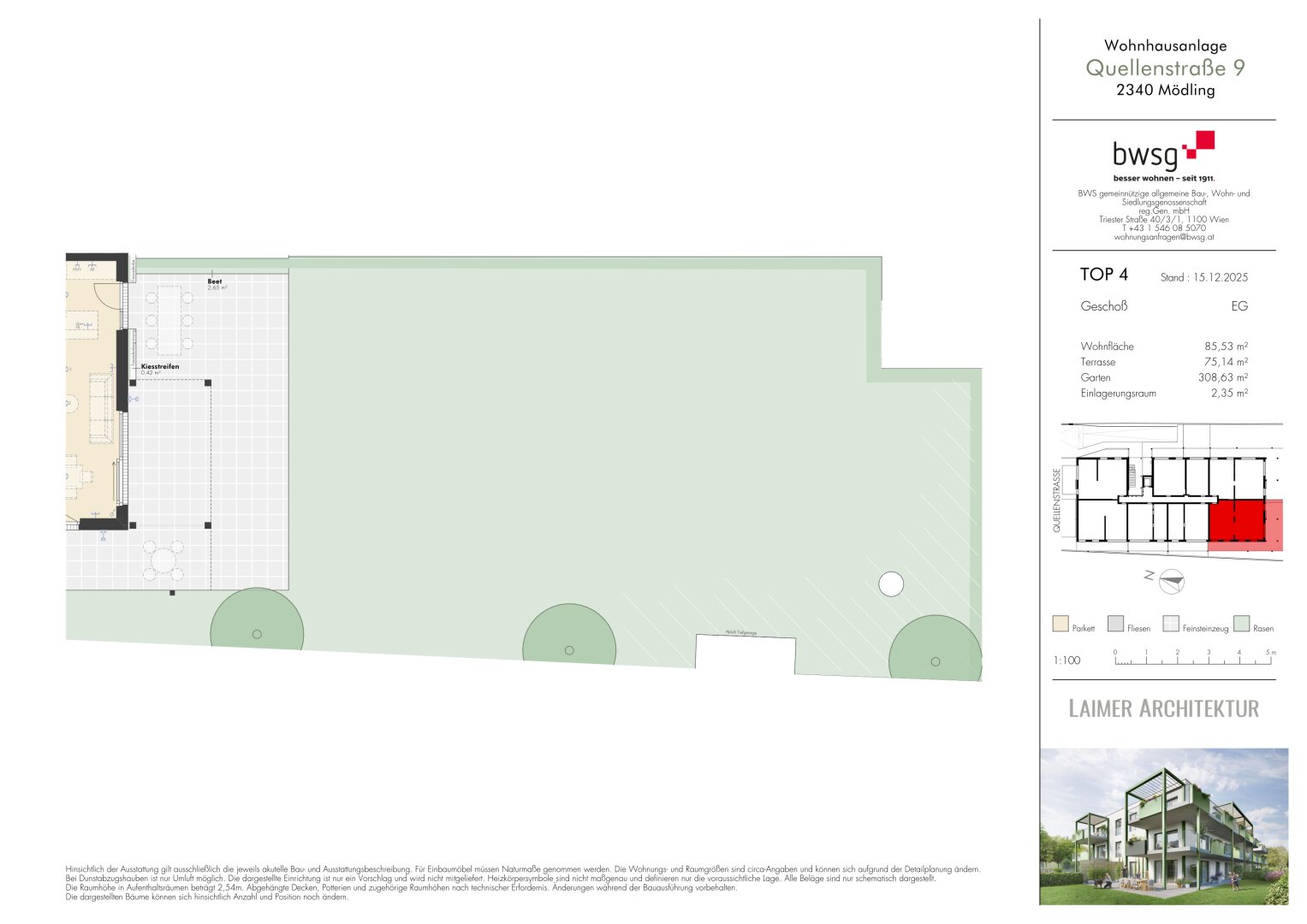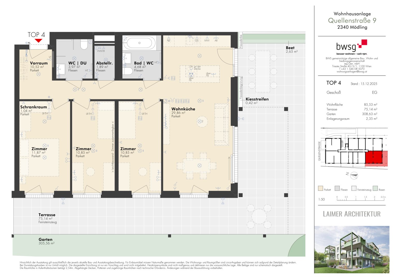 Die Wohnanlage punktet aber auch mit durchdachten Details: Ein Fahrrad- und Kinderwagenabstellplatz sowie barrierefreie Liftanlagen sorgen für ein Plus an Komfort. Für umweltbewusste Mobilität steht eine eigene E-Ladestation zur Verfügung. Die Wohnungen werden über ein energieeffizientes Fernwärmesystem beheizt, das niedrige Betriebskosten und nachhaltiges Wohnen ermöglicht.