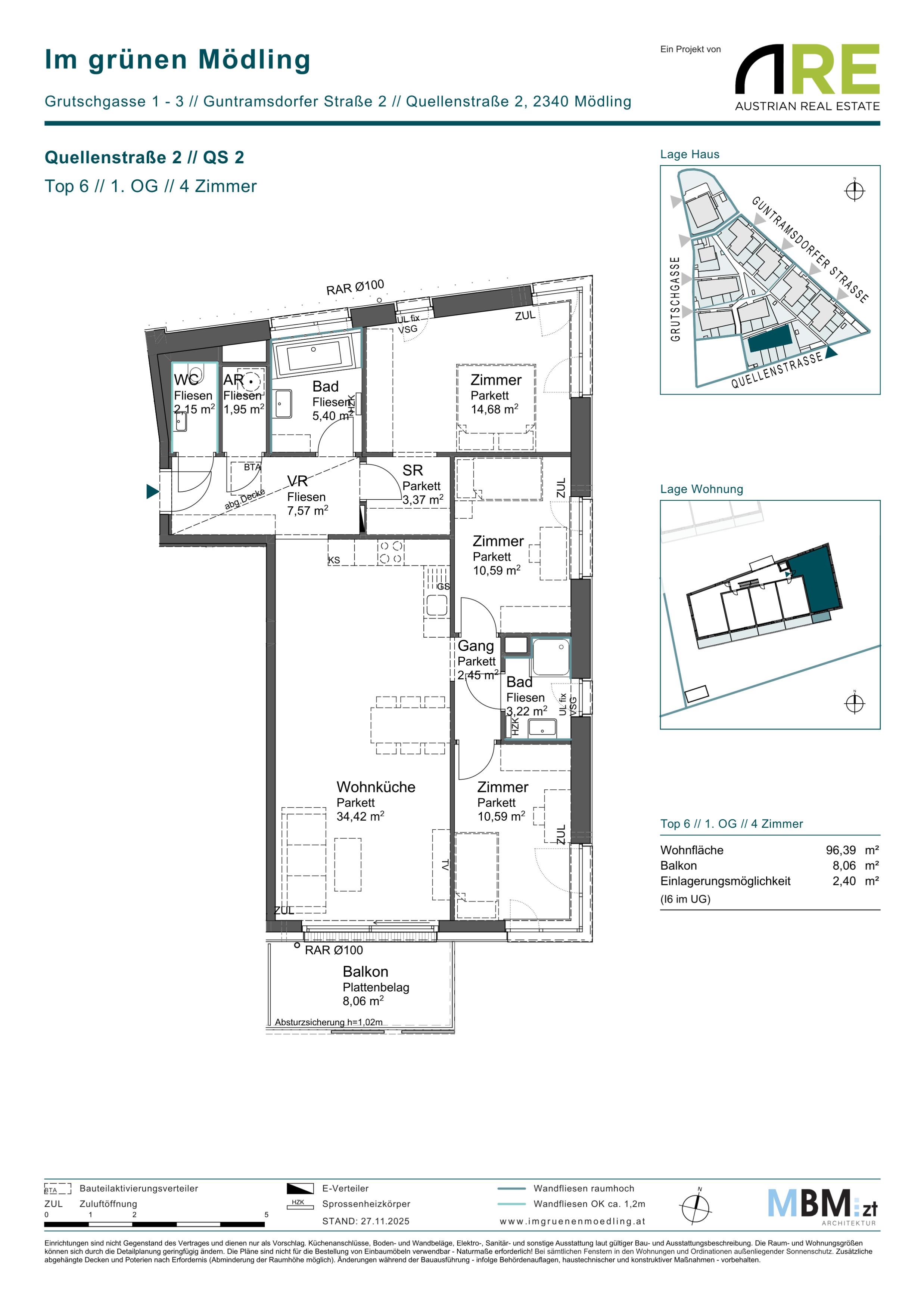 Das Projekt umfasst zehn moderne Baukörper mit drei bis vier Geschossen und insgesamt 116 schlüsselfertige Wohnungen mit 1 bis 5 Zimmern. Private Eigengärten, Balkone oder Terrassen sowie zwei belagsfertige Praxisräumlichkeiten erhöhen die Nutzungsvielfalt und Vermietbarkeit. Ein barrierefreies Erschließungskonzept, Einlagerungsräume zu jeder Wohneinheit und 177 Stellplätze im Untergeschoß sichern eine zeitgemäße, marktorientierte Ausstattung.