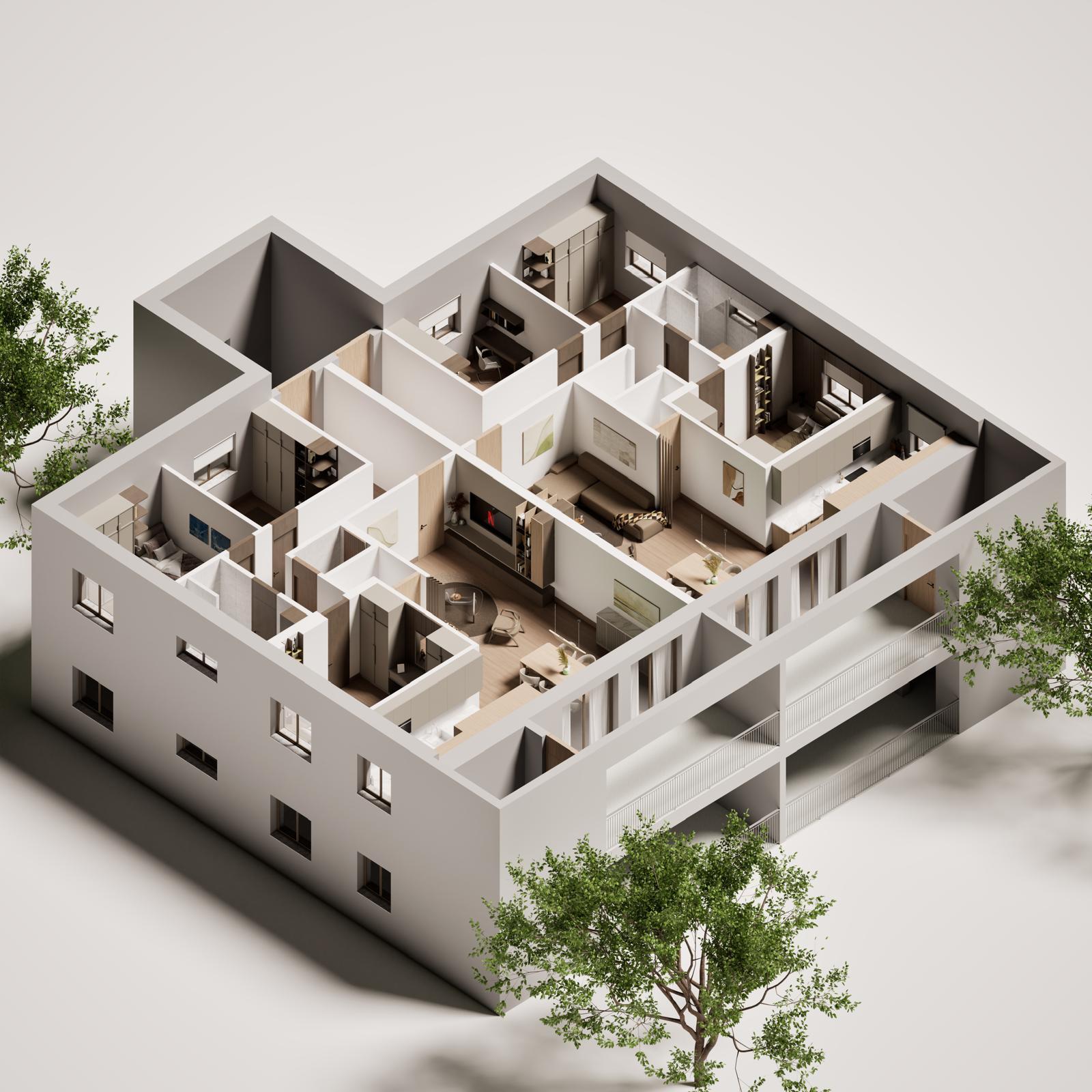 * Raumaufteilung: Vorraum, Bad, WC, AR, 3 Schlafzimmer, Gang, Wohn-Esszimmer mit angrenzender Küche, Loggia, Technikraum