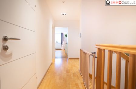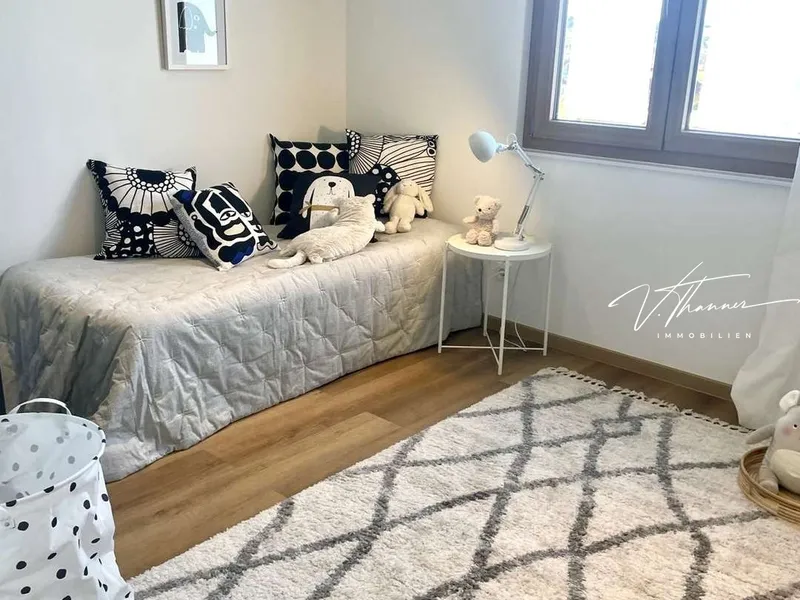 Über eine Treppe geht es hinauf in die zweite Etage. Auf der linken Seite liegt das westseitige Schlafzimmer, das mit verglastem Balkon, begehbarem Wandschrank und herrlicher Abendsonne begeistert - ein ruhiger Ort zum Ankommen und Abschalten. Auf der rechten Seite öffnen sich zwei weitere Zimmer mit östlicher Ausrichtung. Am Morgen durchflutet sanftes Sonnenlicht die Räume, während sich der Blick ins Grüne weitet. Ideal als Kinderzimmer, Homeoffice oder Gästebereich - hell, freundlich und vielseitig nutzbar. Geradeaus befindet sich das geschmackvoll gestaltete Badezimmer sowie ein separates WC - eine praktische Lösung für den Alltag, die Komfort und Funktionalität vereint.