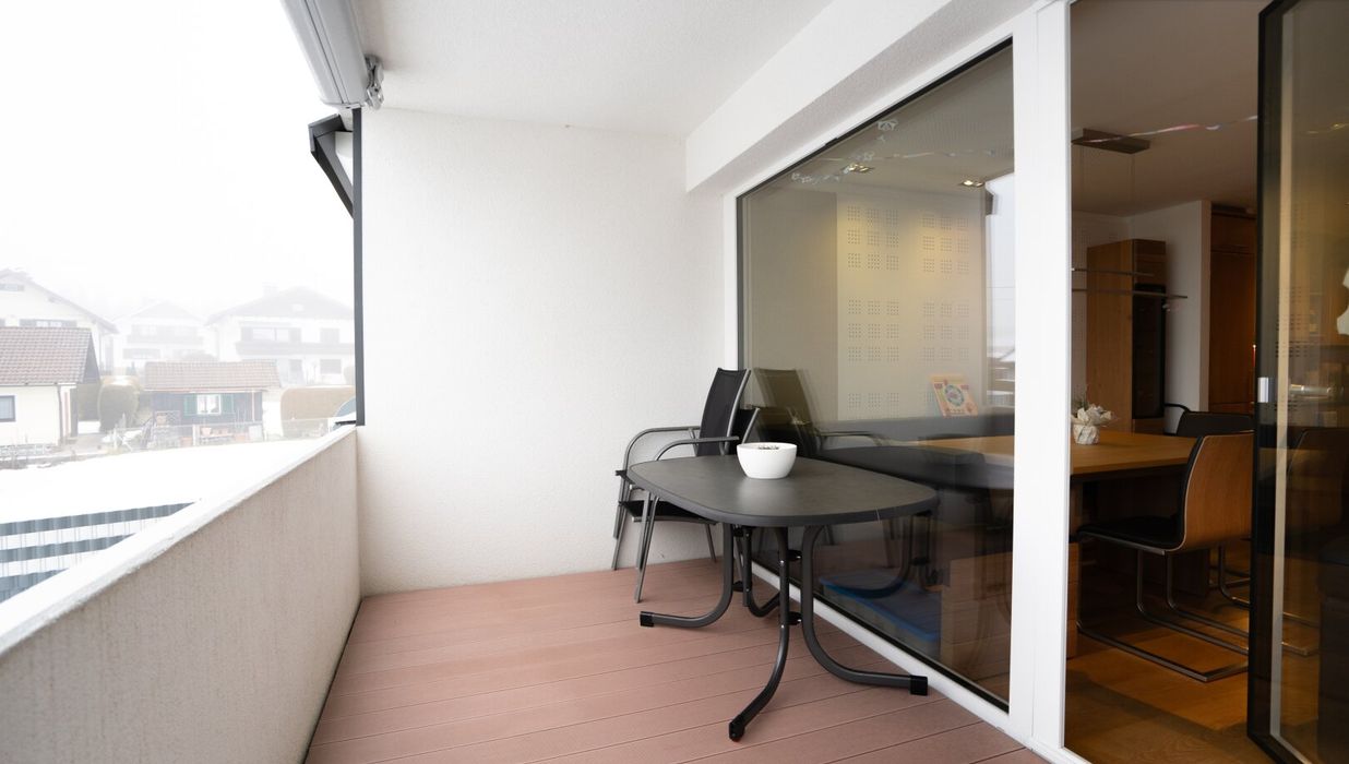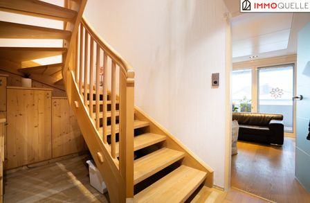 Der erste Stock empfängt mit einem hellen, offen gestalteten Wohn-Essbereich, der sich direkt zum großzügigen Westbalkon öffnet. Von hier aus genießt man freie Sicht über Wipfel und Dächer - ein Ort für sonnige Nachmittage, laue Abende und Momente der Ruhe im Licht des Sonnenuntergangs.