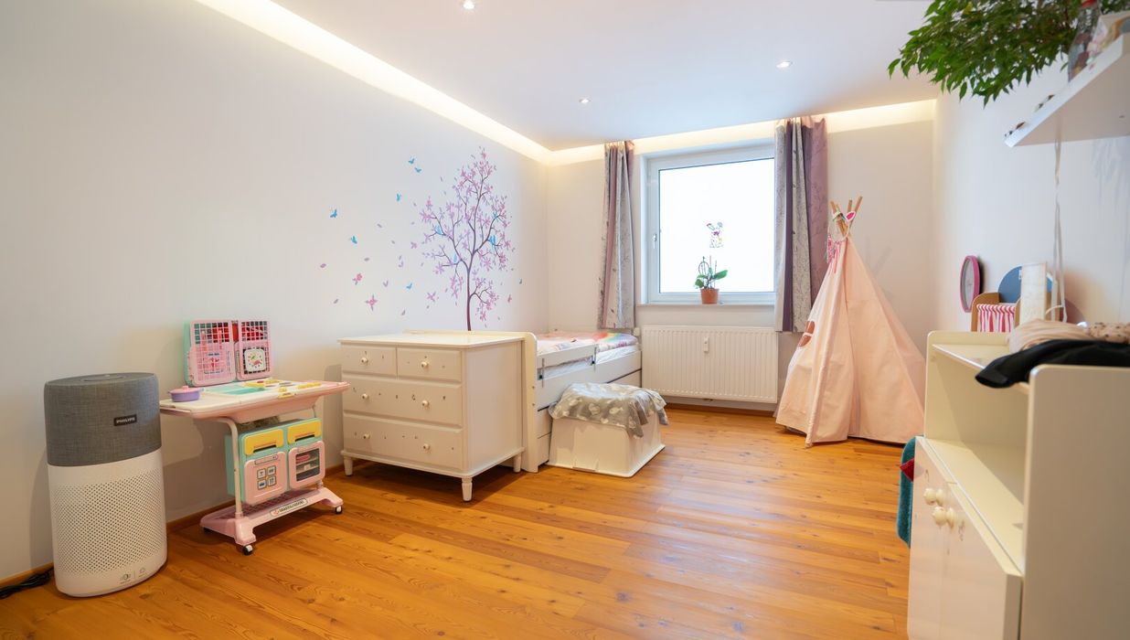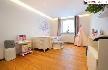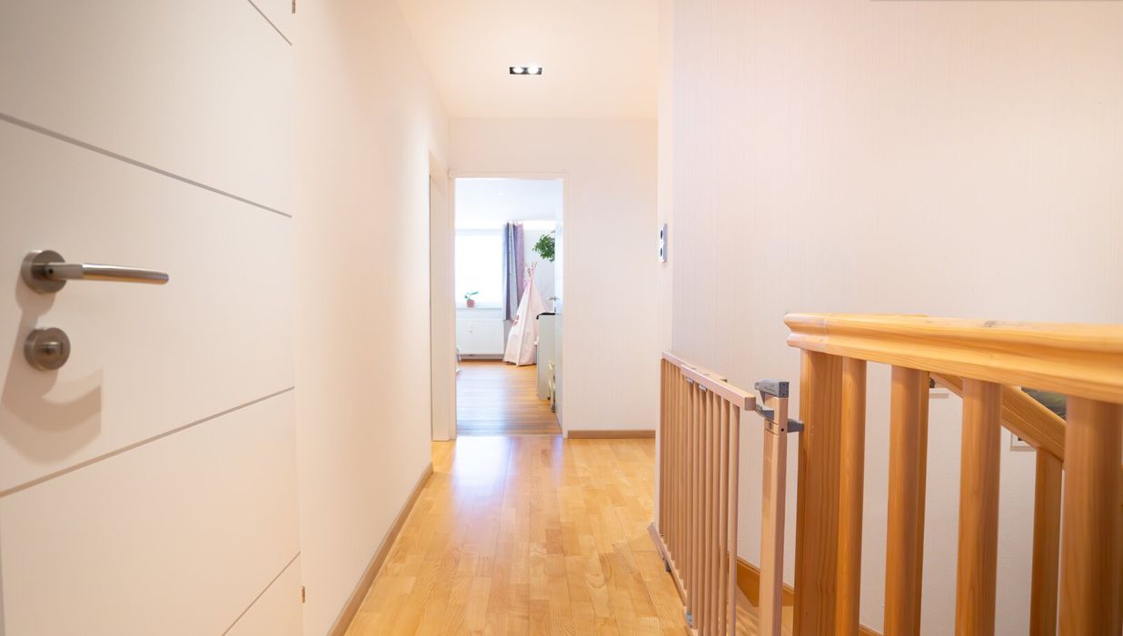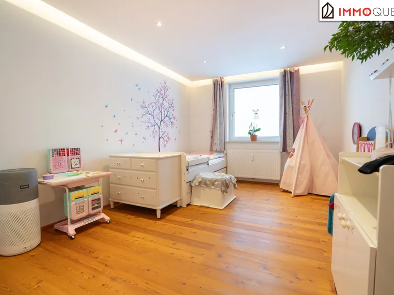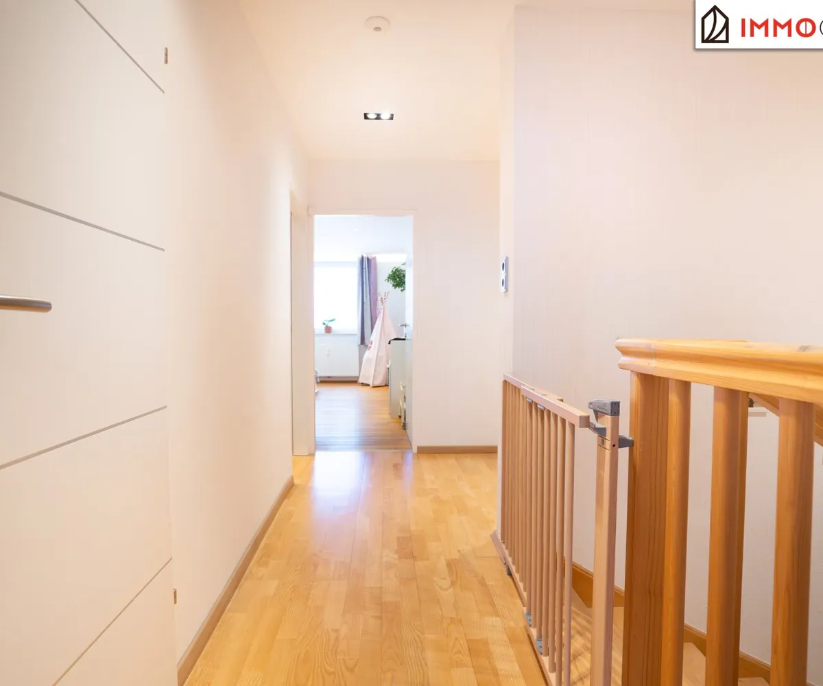 Über eine Treppe geht es hinauf in die zweite Etage. Auf der linken Seite liegt das westseitige Schlafzimmer, das mit verglastem Balkon, begehbarem Wandschrank und herrlicher Abendsonne begeistert - ein ruhiger Ort zum Ankommen und Abschalten. Auf der rechten Seite öffnen sich zwei weitere Zimmer mit östlicher Ausrichtung. Am Morgen durchflutet sanftes Sonnenlicht die Räume, während sich der Blick ins Grüne weitet. Ideal als Kinderzimmer, Homeoffice oder Gästebereich - hell, freundlich und vielseitig nutzbar. Geradeaus befindet sich das geschmackvoll gestaltete Badezimmer sowie ein separates WC - eine praktische Lösung für den Alltag, die Komfort und Funktionalität vereint.
