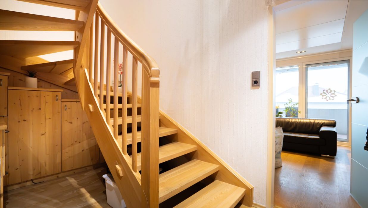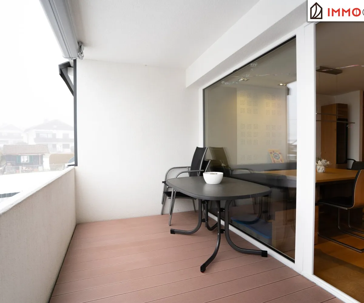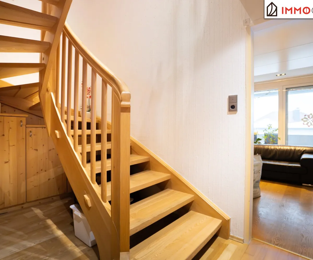 Der erste Stock empfängt mit einem hellen, offen gestalteten Wohn-Essbereich, der sich direkt zum großzügigen Westbalkon öffnet. Von hier aus genießt man freie Sicht über Wipfel und Dächer - ein Ort für sonnige Nachmittage, laue Abende und Momente der Ruhe im Licht des Sonnenuntergangs.
