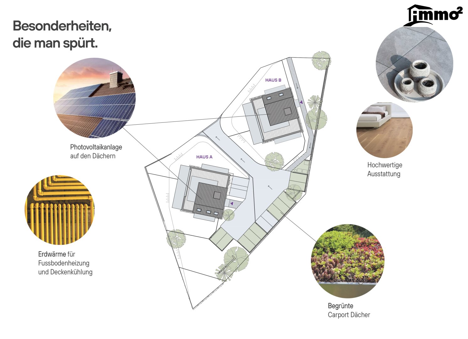Die hellen Kellerabteile bieten praktische Rückzugsorte, während die privaten Gartenbereiche mit geschmackvollen Zäunen und eigenen Gartentoren Privatsphäre und Geborgenheit schenken. Optional lässt sich eine E-Ladevorrichtung für Carports und Stellplätze integrieren, um den Wohnkomfort auch im Alltag nachhaltig zu erhöhen.