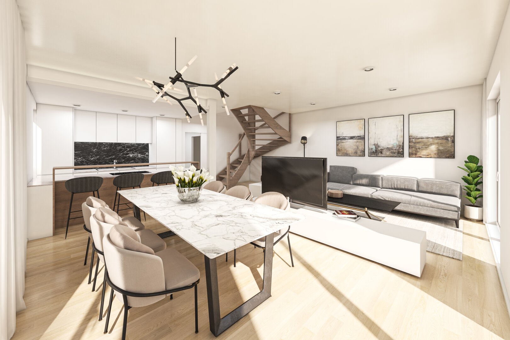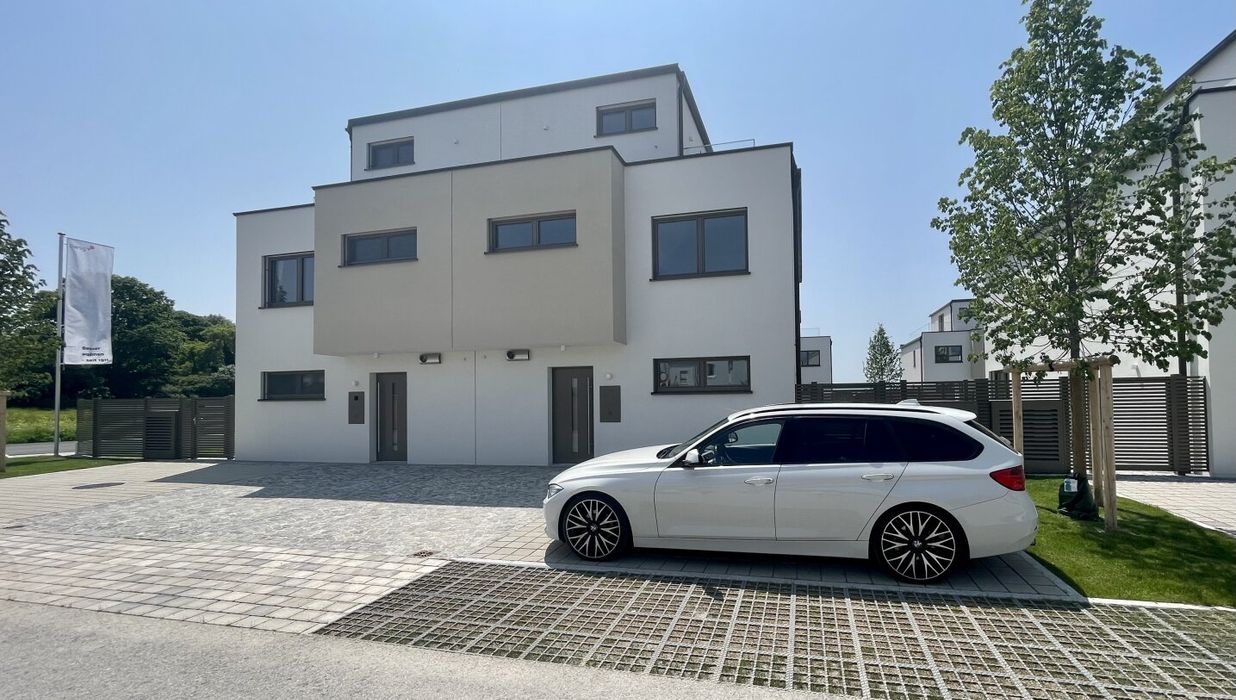teils vom Baukörper selbst überdachte Terrasse in den Garten, die Richtung Süden ausgerichtet ist. Das Obergeschoß wird mit einer Stiege, welche aus dem Wohnzimmer in einen Gang führt, erschlossen. Der Gang führt in drei gut geschnittene Zimmer, weiters erschließt er ein WC und ein Badezimmer mit Badewanne und Dusche. Im Dachgeschoß befindet sich ein geräumiges Studio, das viele Nutzungsmöglichkeiten zulässt. Ob als Büro mit Küchenzeile, Fitnessraum mit Sauna oder großzügiger Masterbedroom mit Bad en Suite genutzt werden kann. Vom Studio aus gelangt man ebenso auf die herrliche Dachterrasse mit Blick auf den Schneeberg und die weitere Umgebung, dort kann man die Seele baumeln lassen und lauschige Stunden im Freien verbringen. Jedes Haus hat zwei PKW-Stellplätze im Freien, einen großzügigen Garten mit Terrasse sowie einer Dachterrasse. Draussen sind bereits die Anschlüsse für einen Pool vorbereitet damit dem Badespaß im eigenen Garten nichts mehr im Wege steht.