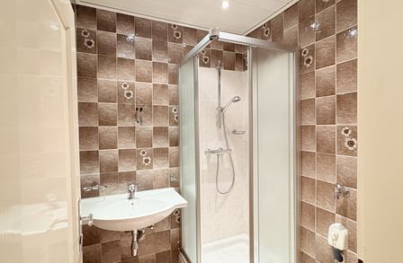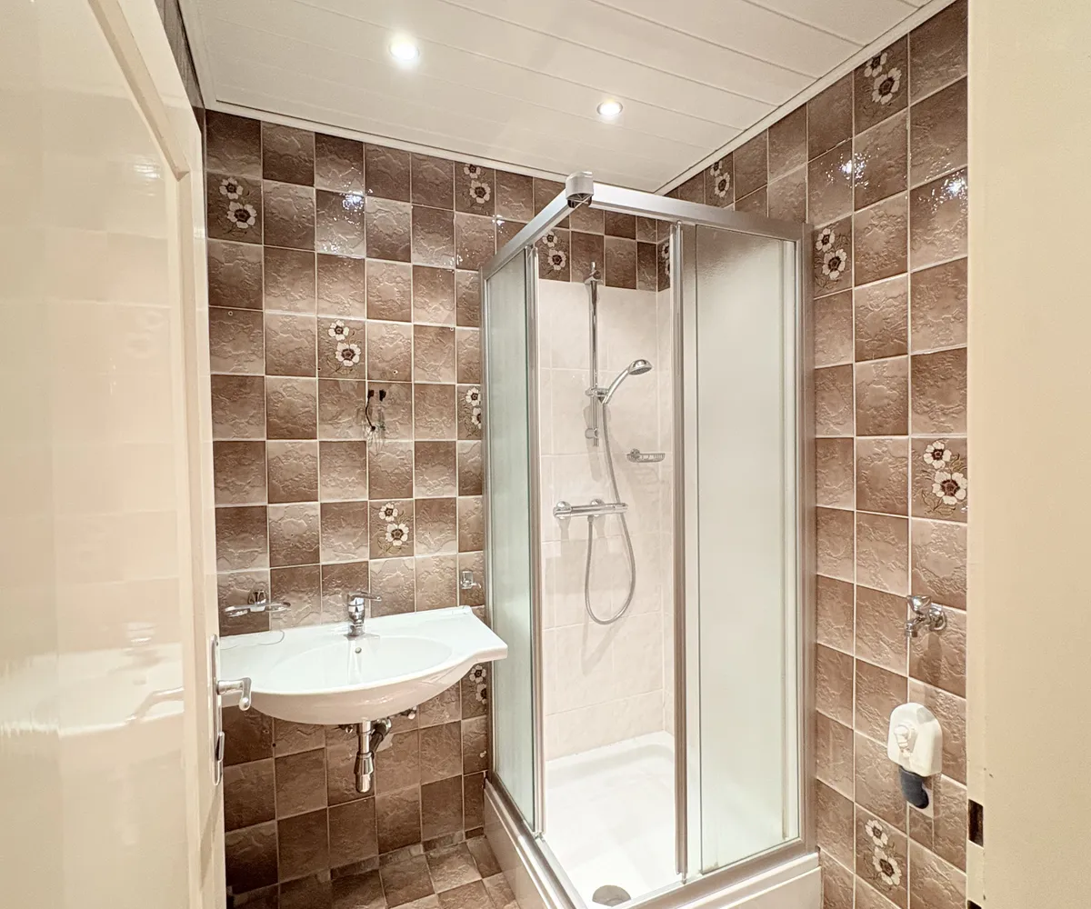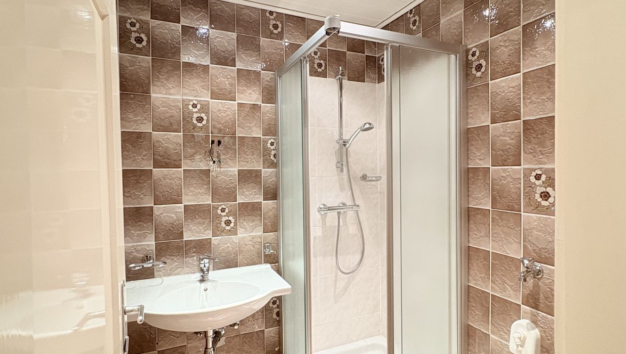 - Badezimmer mit Dusche und Waschmaschinenanschluss
