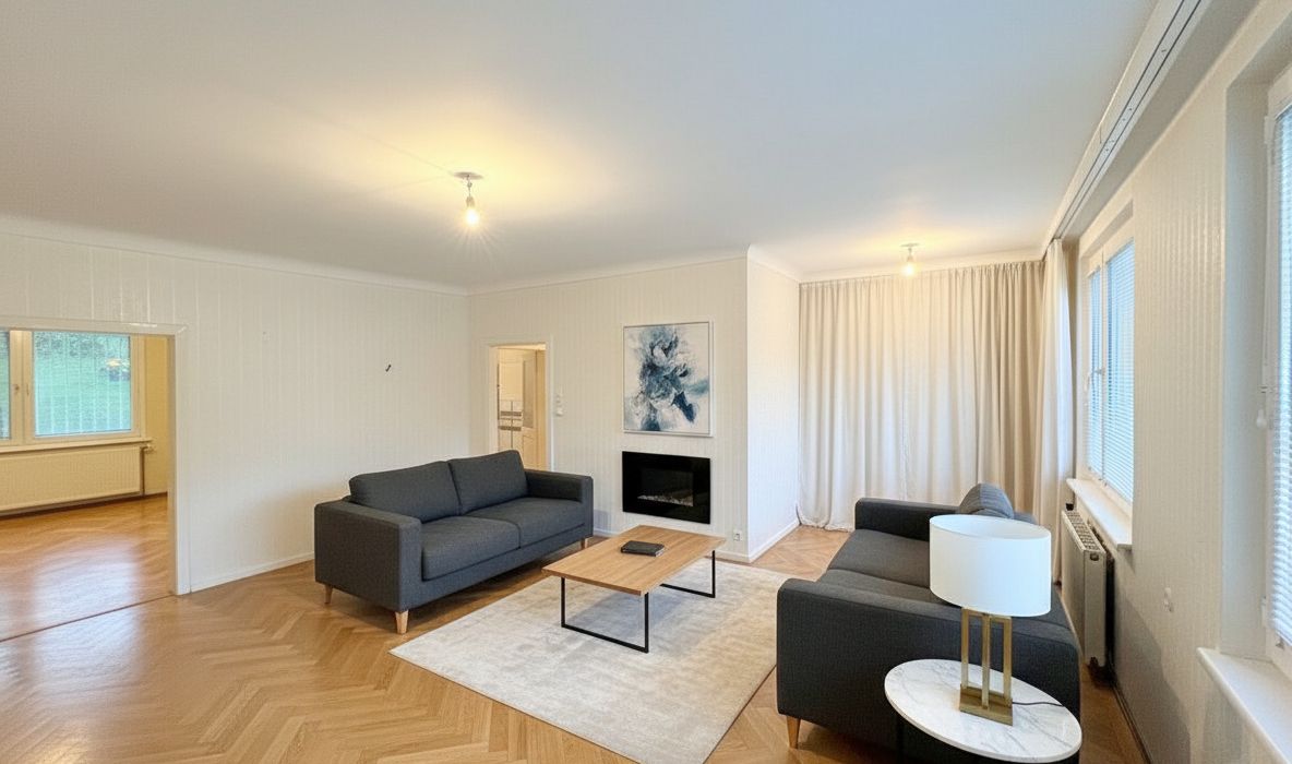 Die dargestellten möblierten Räume sind KI-generierte Visualisierungen und dienen lediglich der Veranschaulichung möglicher Einrichtungskonzepte . Die Möblierung und Sanierung ist nicht im Kaufpreis enthalten .
